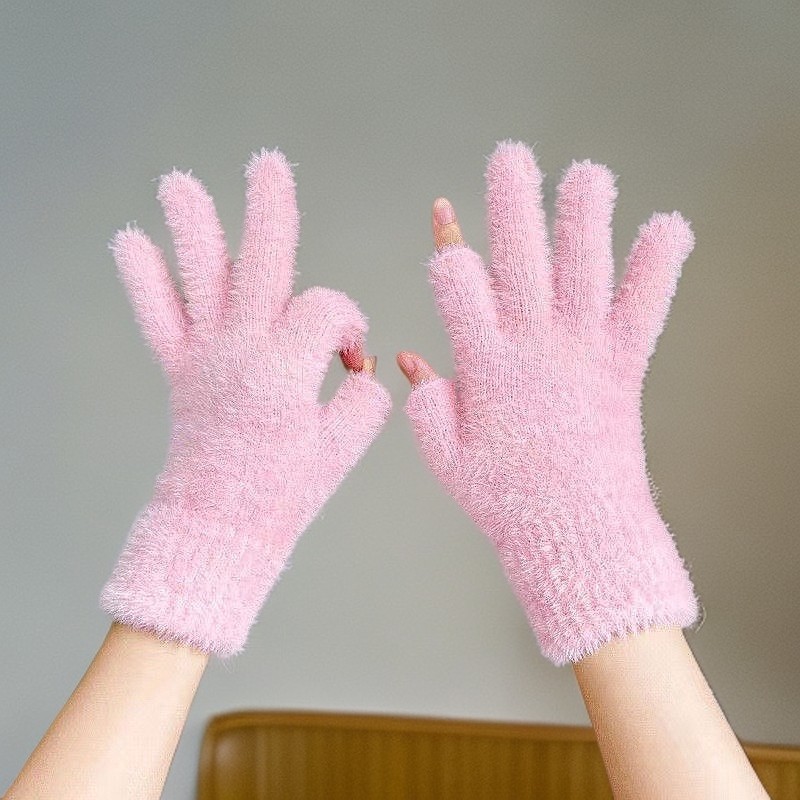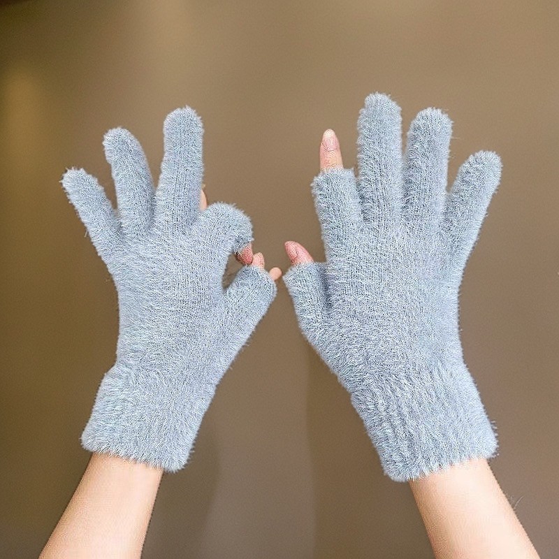 露二指骑行手套保暖冬季触屏韩版毛绒防寒漏指骑车办公写字神器男
