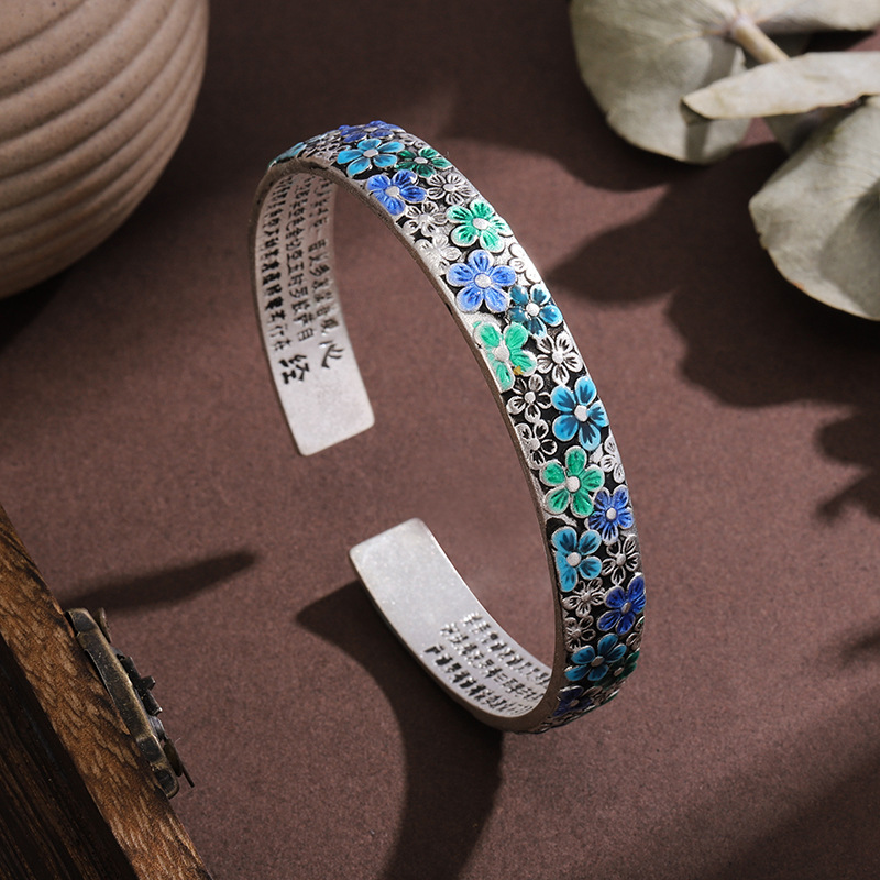 白铜镀银手镯珐琅彩名族风梅花心经手镯子珐琅浮雕开口手镯