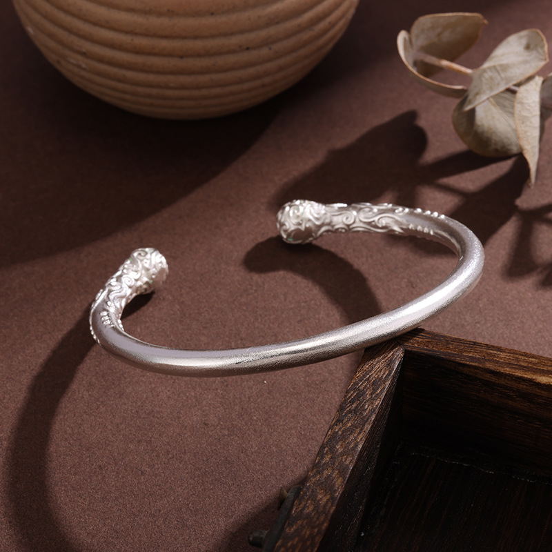 抖音直播白铜镀银复古牡丹花对珠开口手镯民族风錾刻莲花磨砂手环