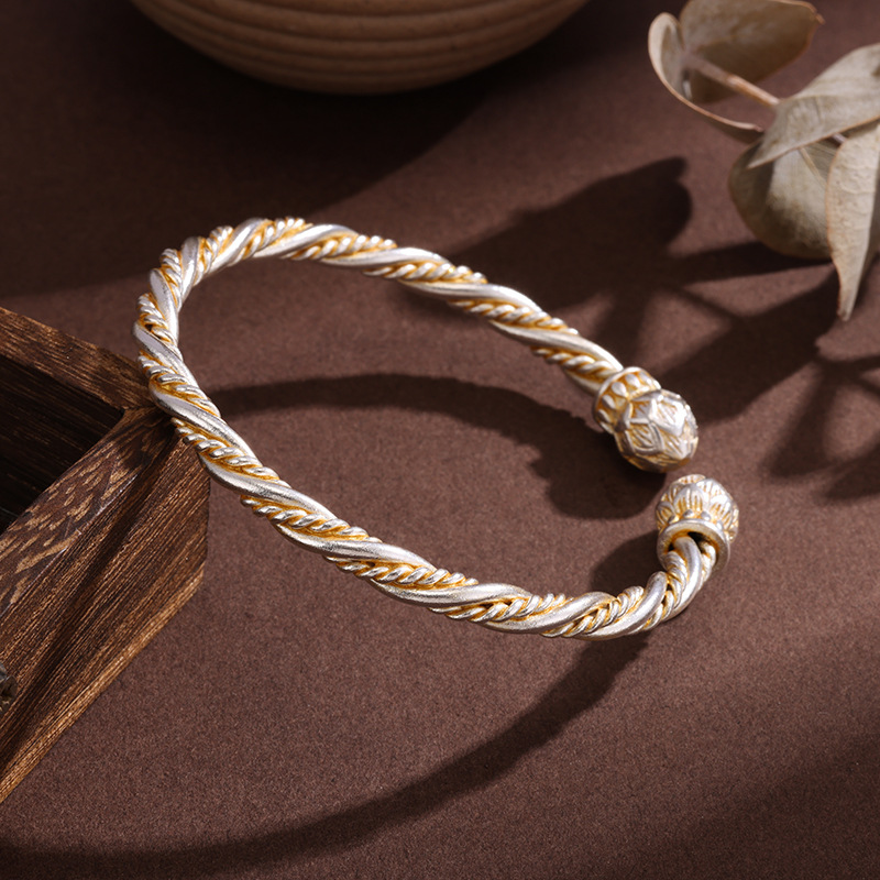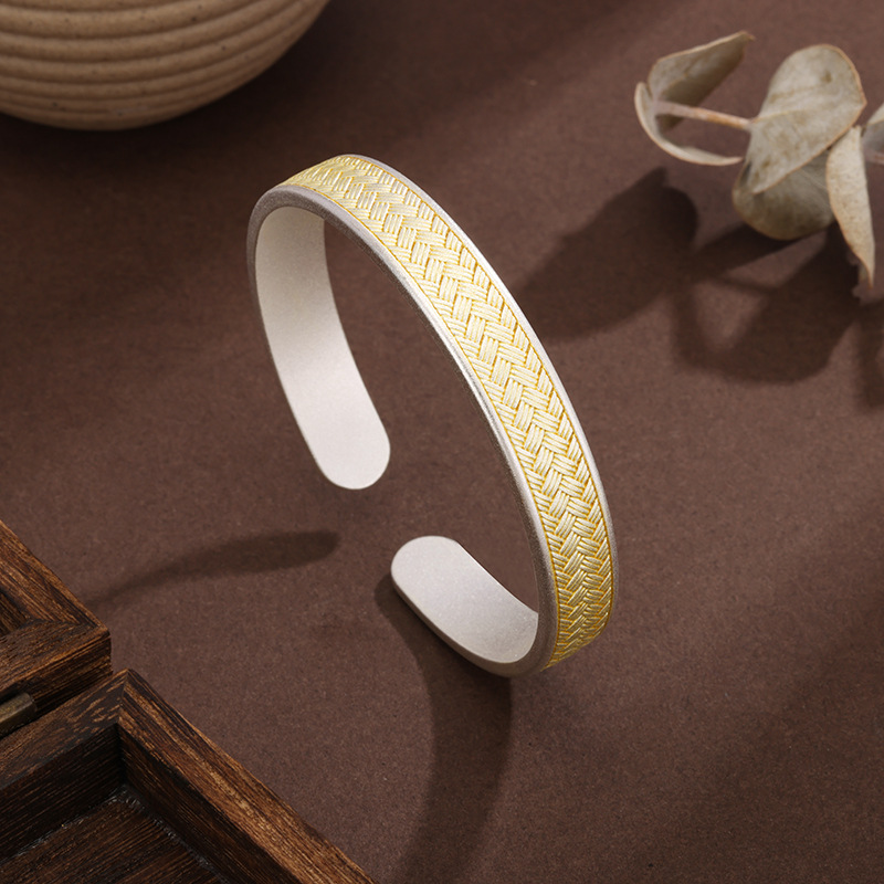 白铜镀银手镯描金编织开口手镯新中式描金简约银镯子送女友礼物