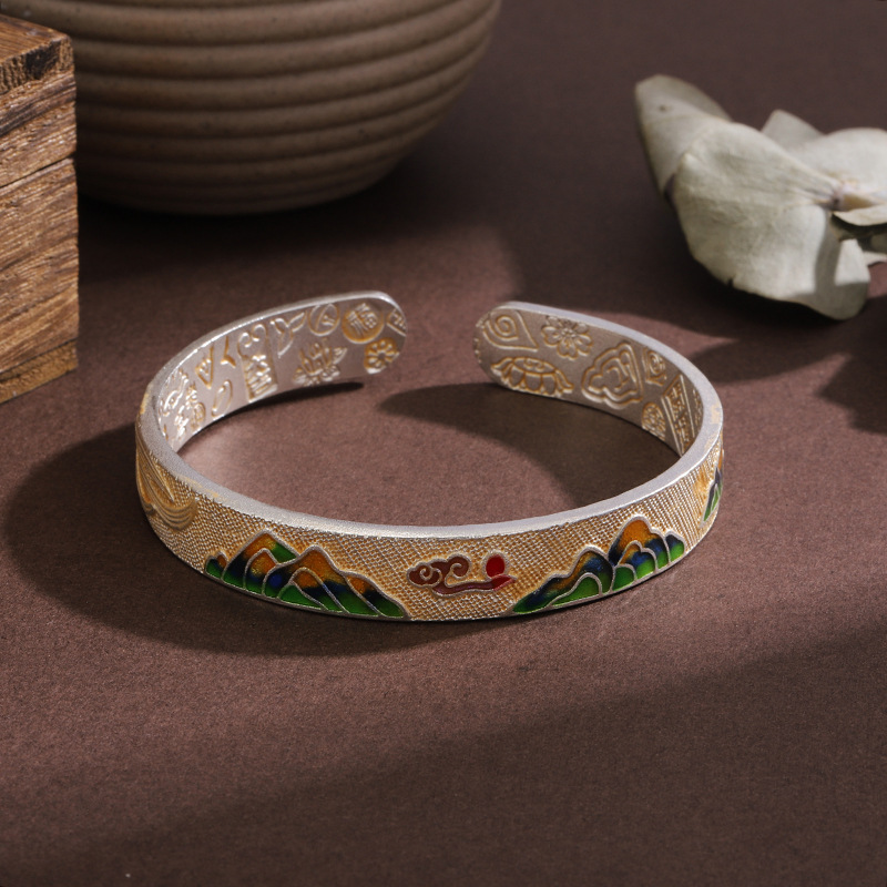 白铜镀银手镯锦绣山河手镯吉言描金珐琅彩千里江山手镯国风镯子