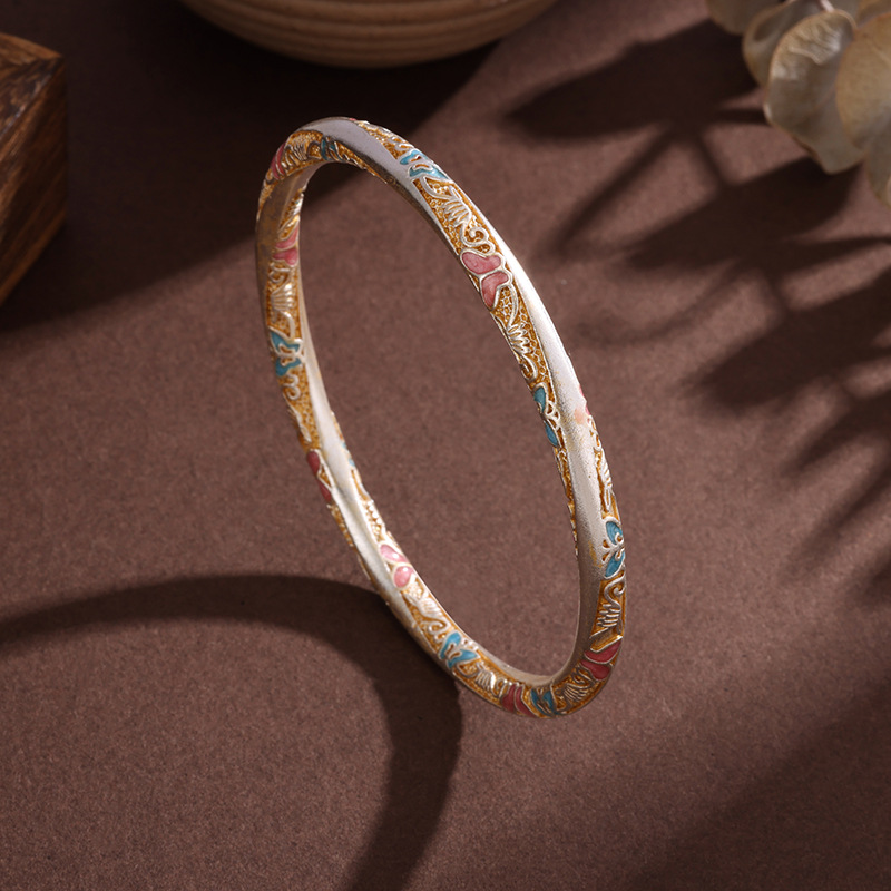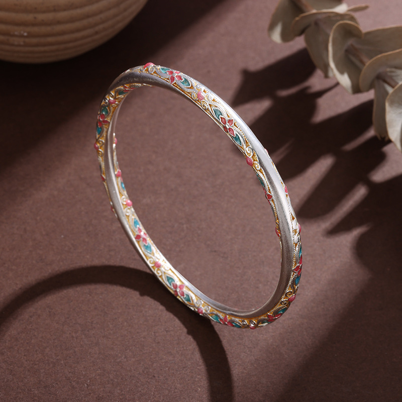 白铜镀银手镯珐琅彩描金探春国风新中式古法实心闭口镯子生日礼物