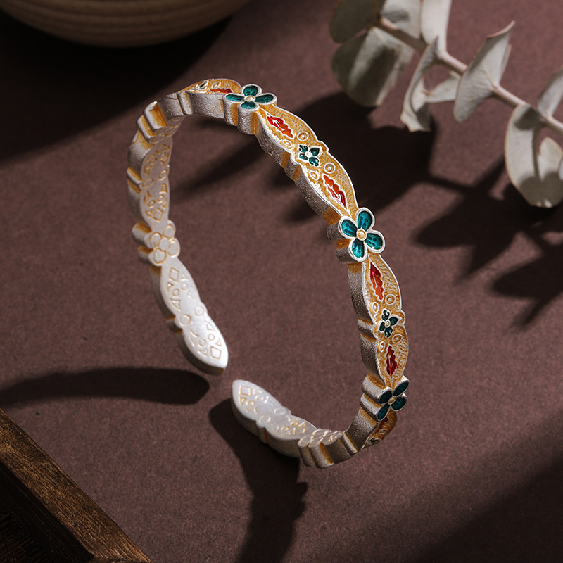 白铜镀银手镯描金珐琅如意彩花开口手镯女新中式国风送女友礼物