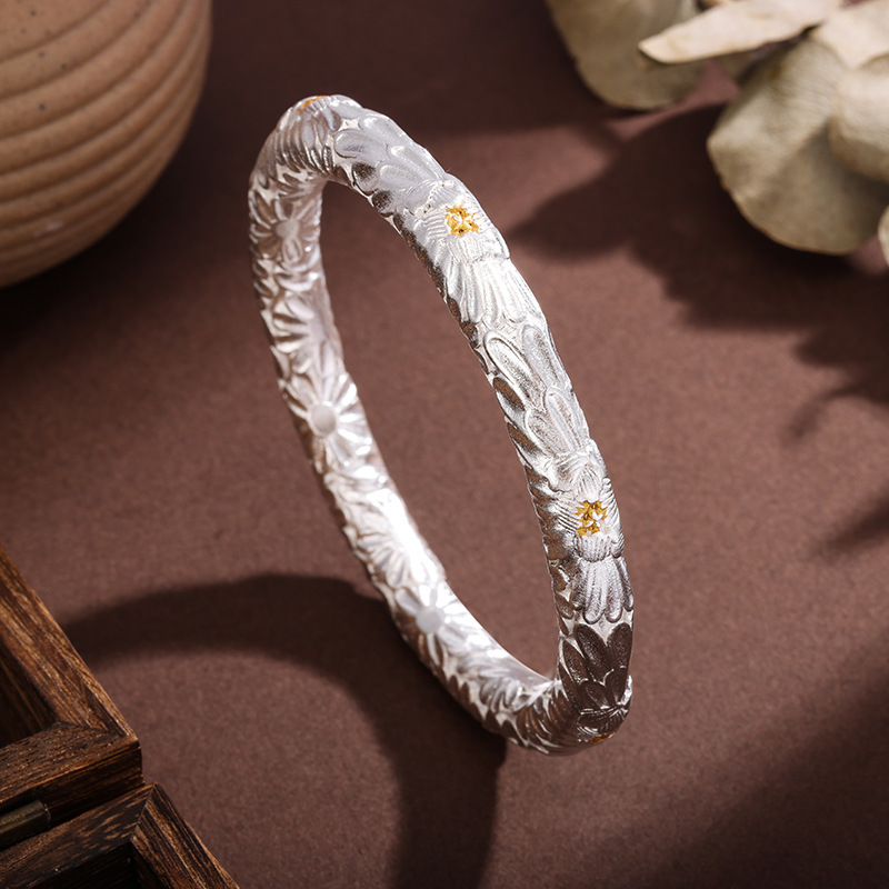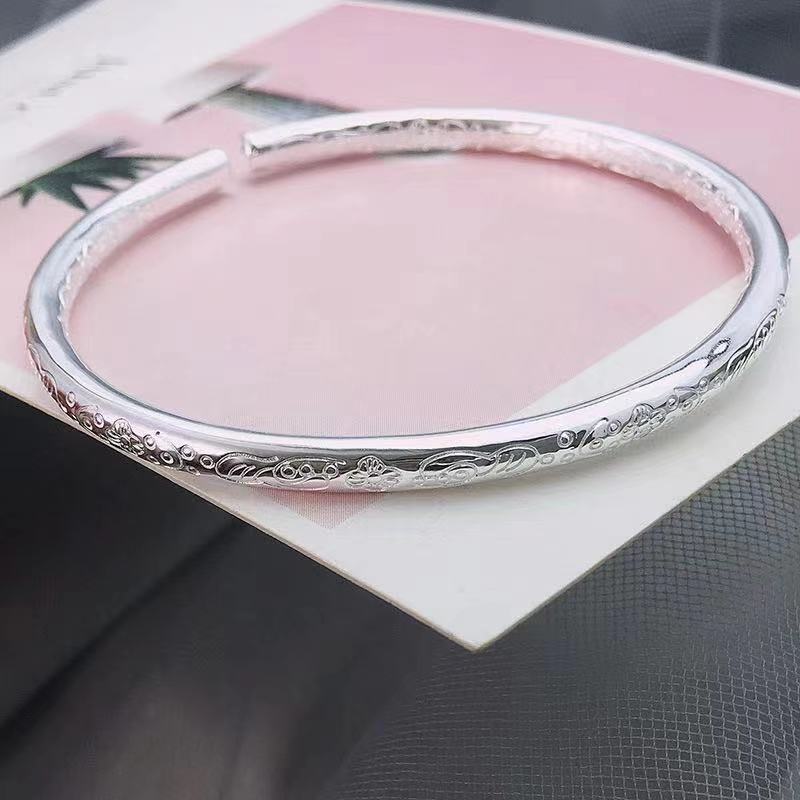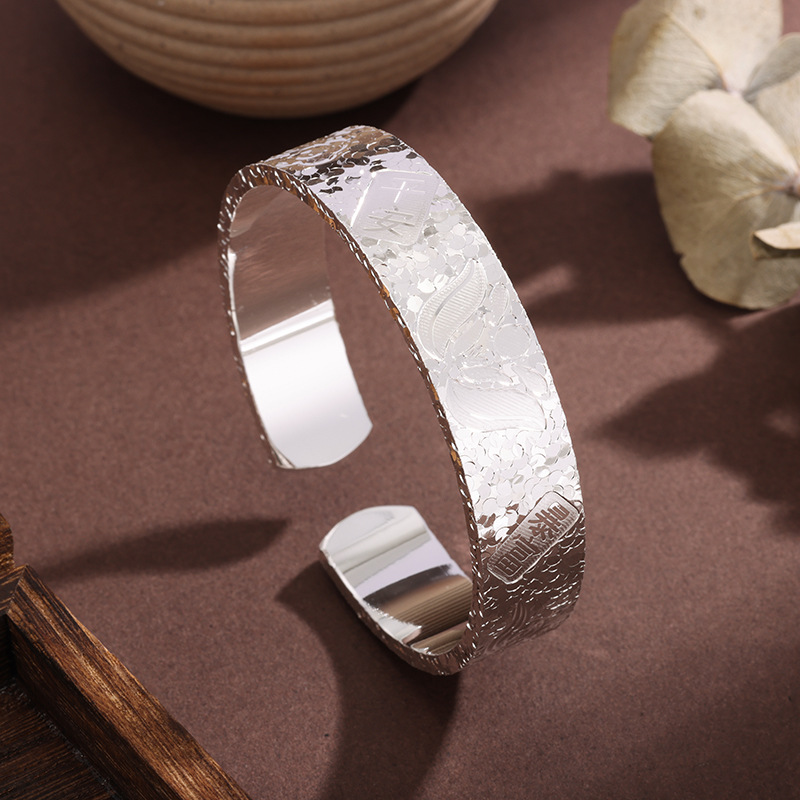 白铜镀银手镯宽版吉言碎冰冰手镯实心开口錾刻荷花平安爆闪手环