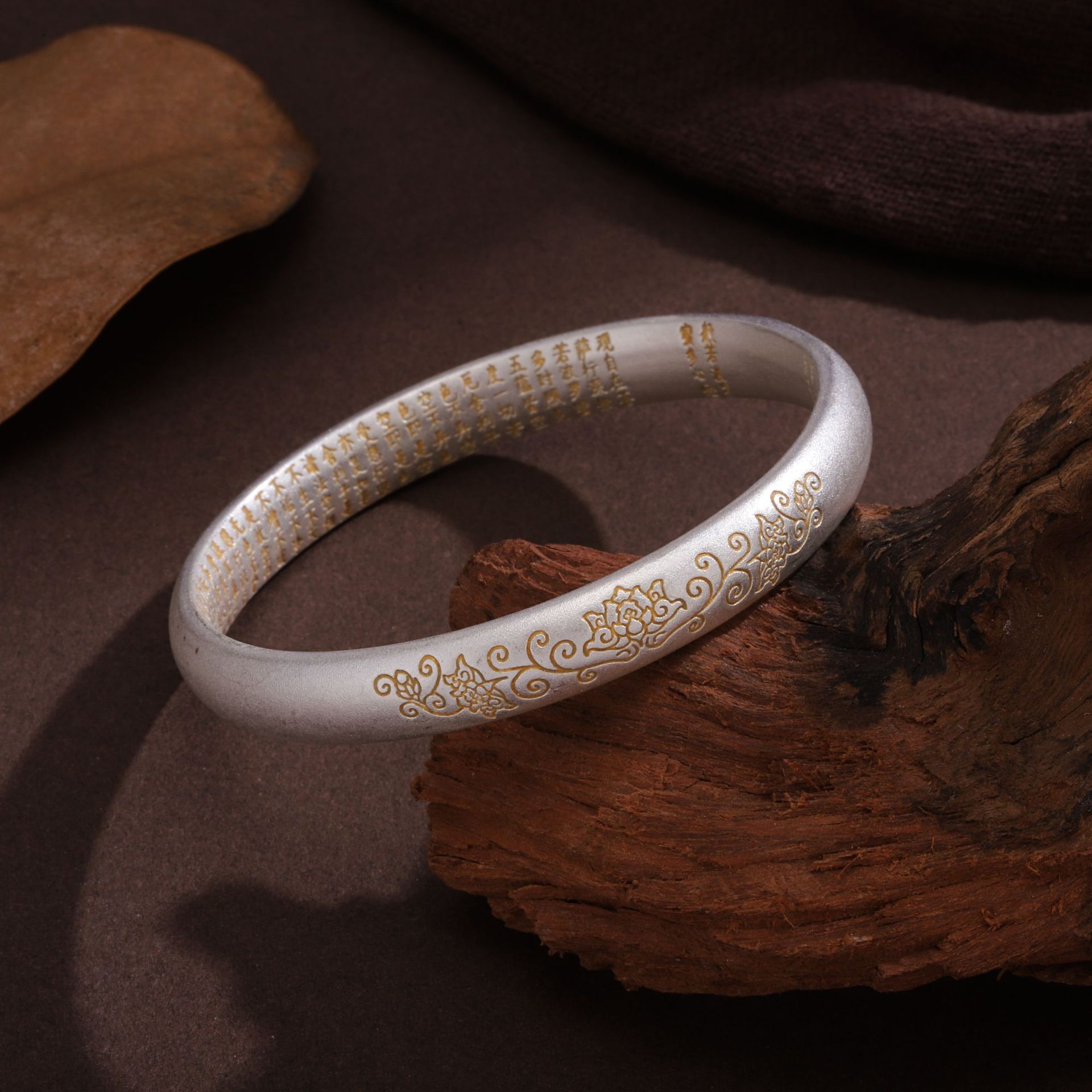 复古古法白铜描金实心蔷薇花闭口银色手镯内环心经生日礼物