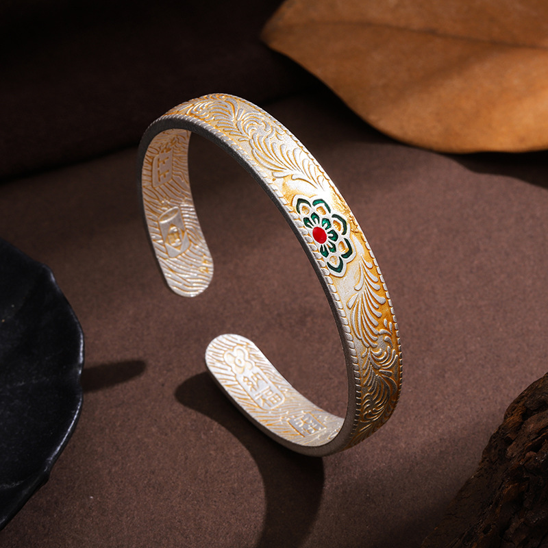 白铜镀银新中式唐草纹宝相花描金珐琅彩国风民族风招财纳福镯子