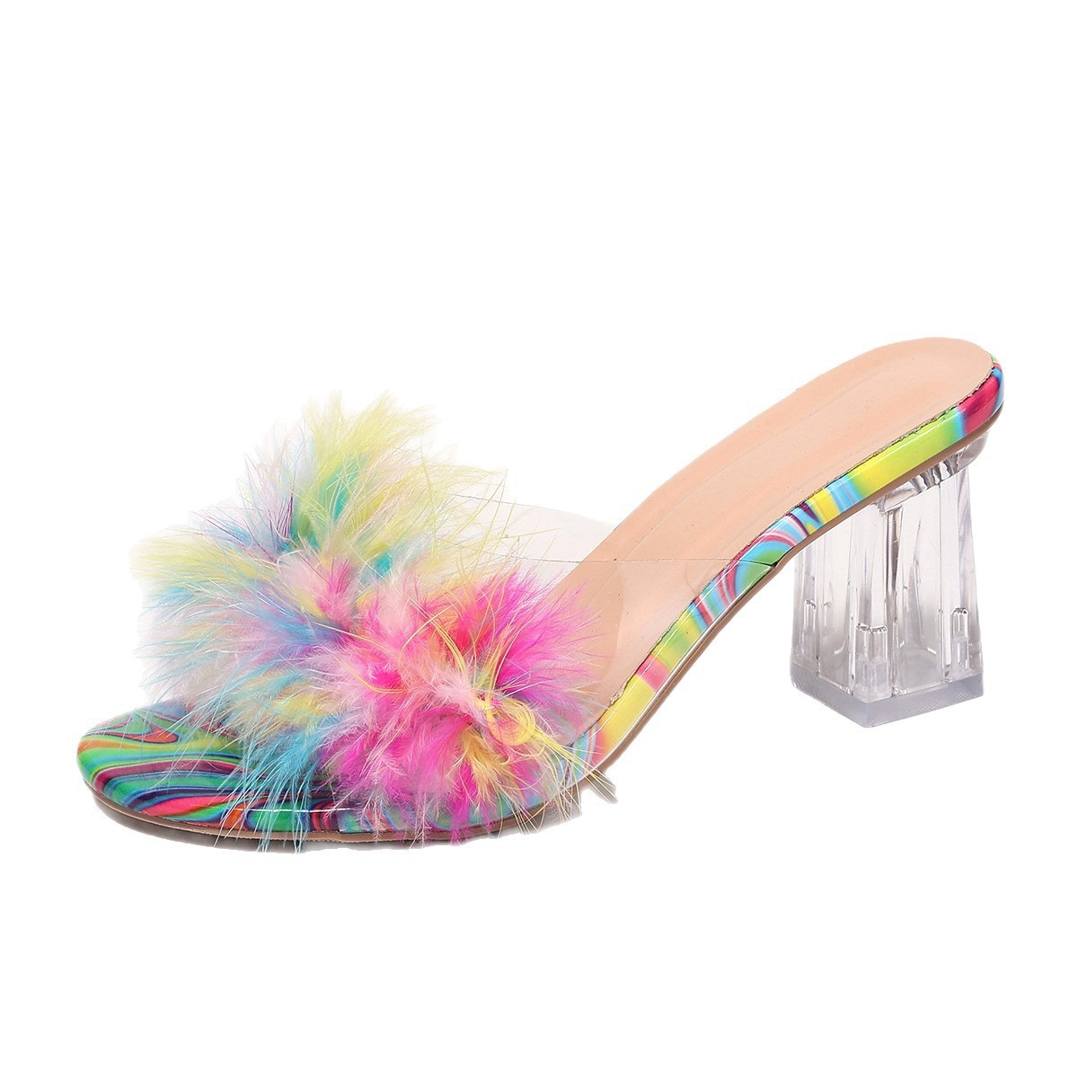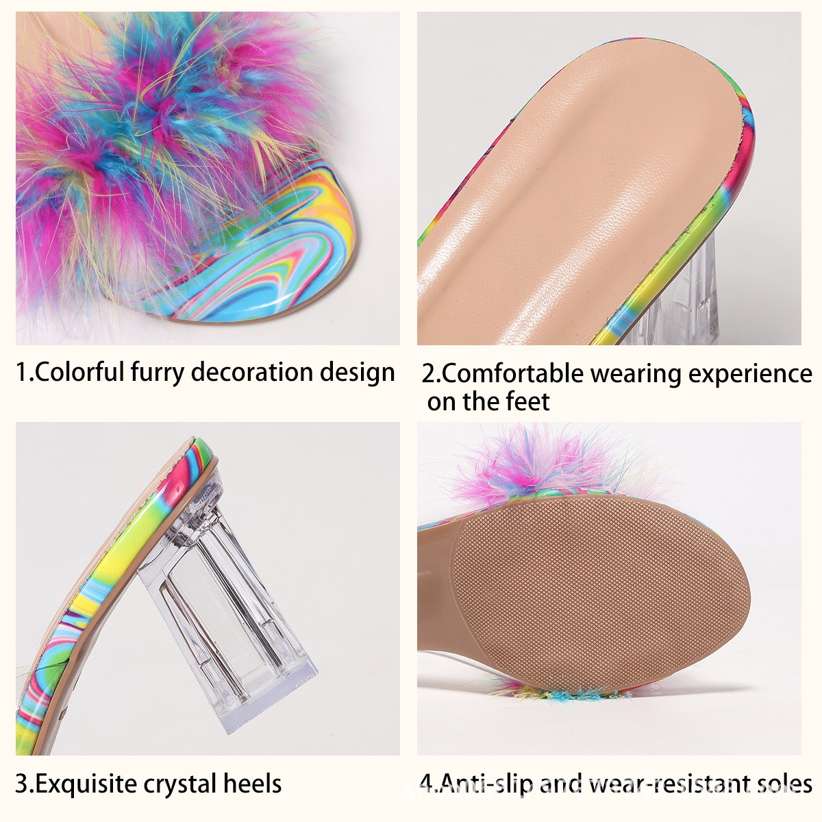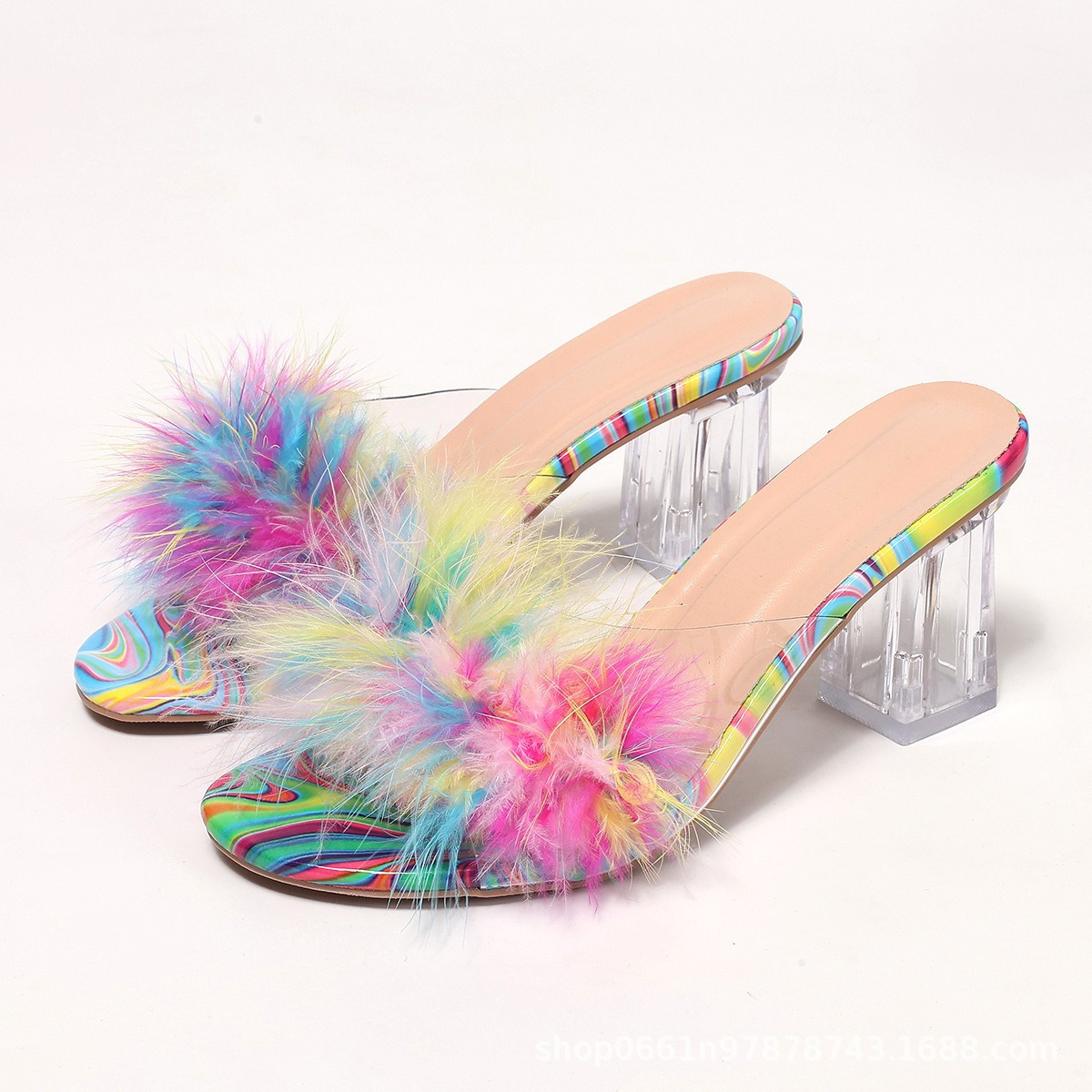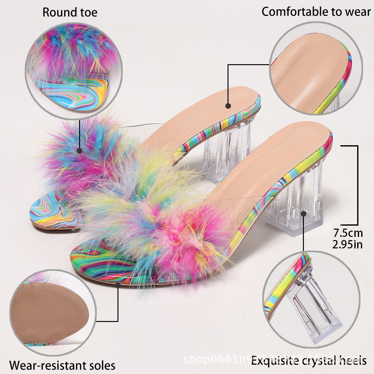 外贸镂空粗跟鱼嘴中跟装饰毛凉拖鞋2025夏季跨境新款沙滩女鞋现货