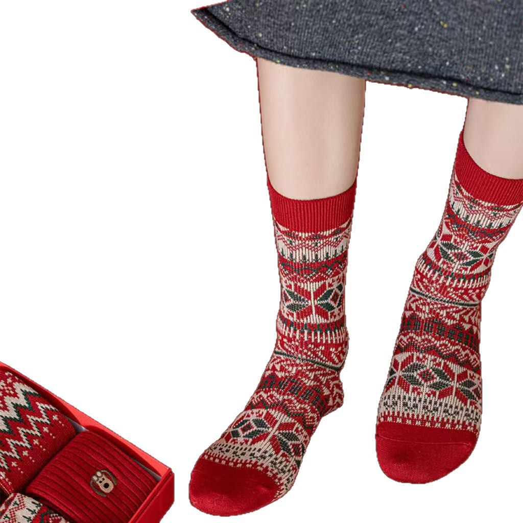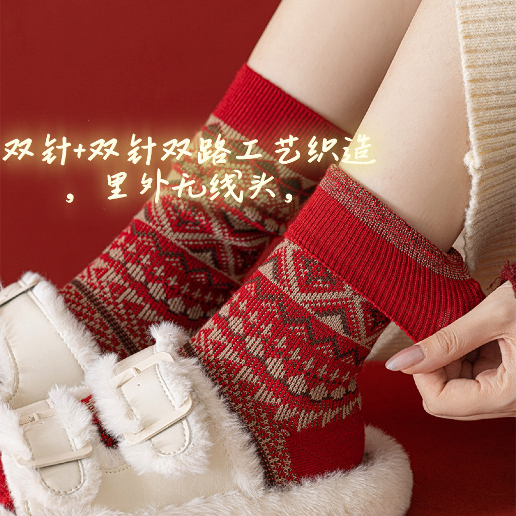 双针双路羊毛红袜女中筒袜无骨新年本命年结婚喜袜礼盒装大红刺绣