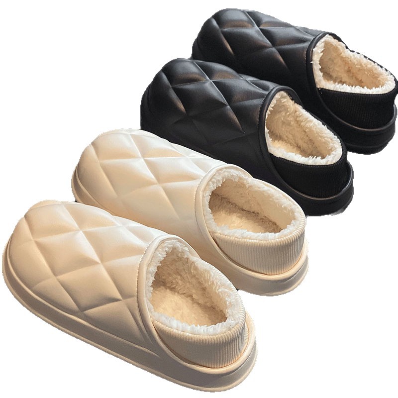冬季加绒棉拖鞋女男菱格纹防水耐磨踩屎感软底保暖居家外穿适配