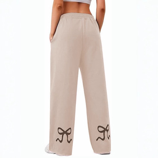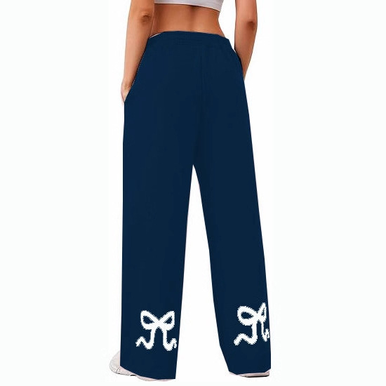 女式长裤阔腿高腰可调节抽绳长裤带口袋休闲轻便蝴蝶结印花阔脚裤