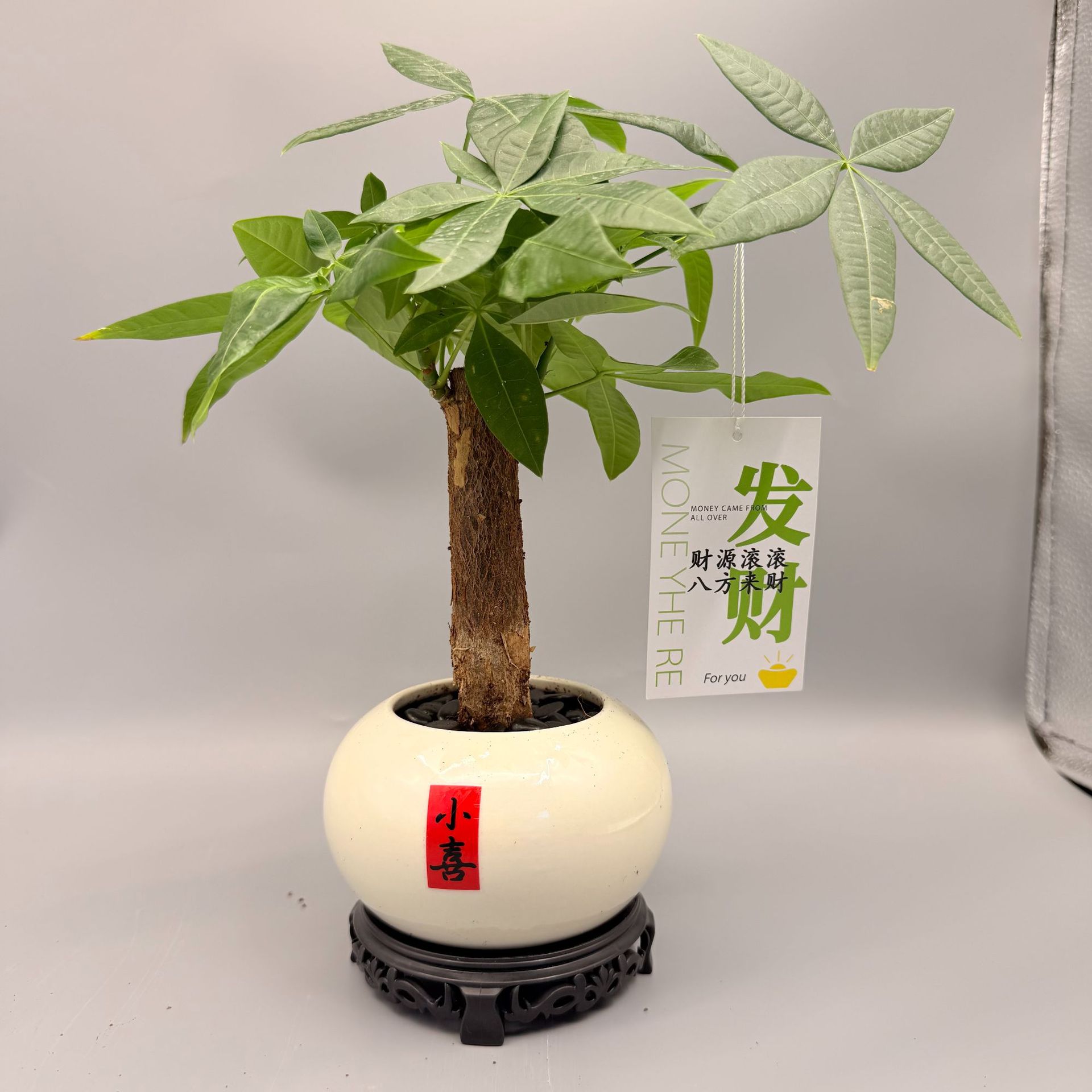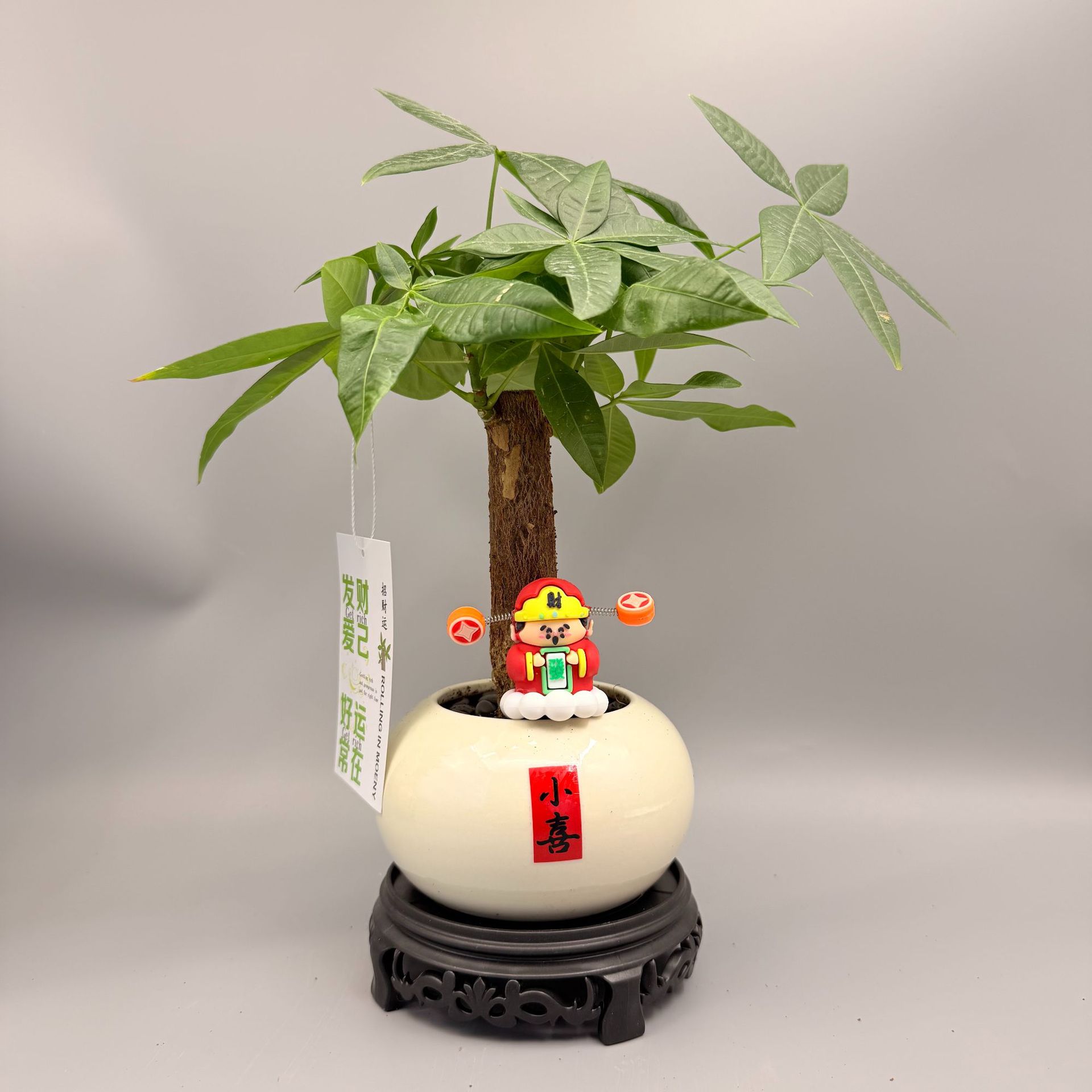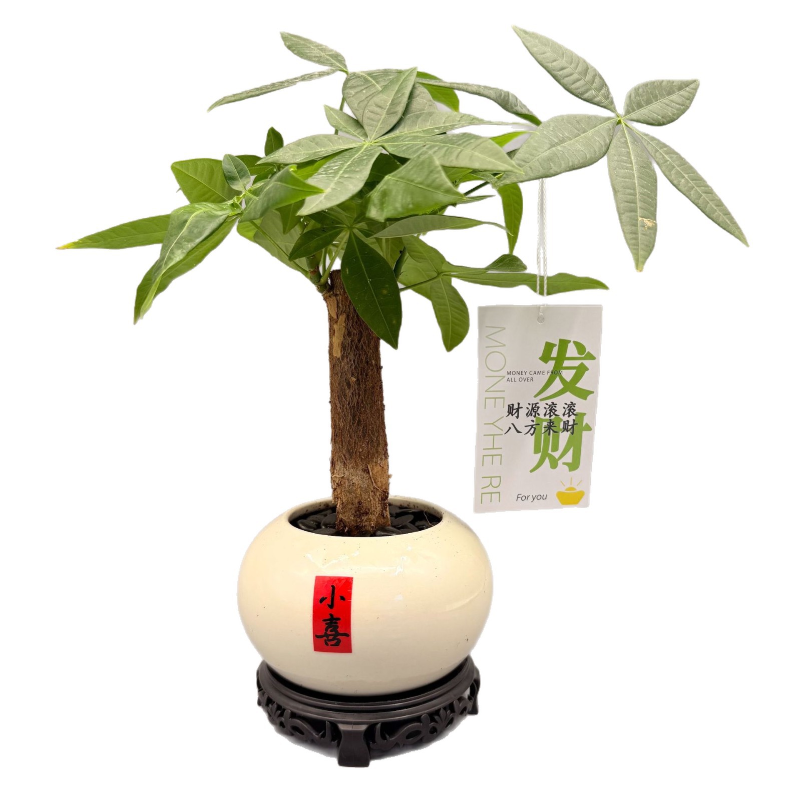 规格单杆发财树+小喜米白圆球陶瓷盆+含底垫(送元宝+吊牌一套)