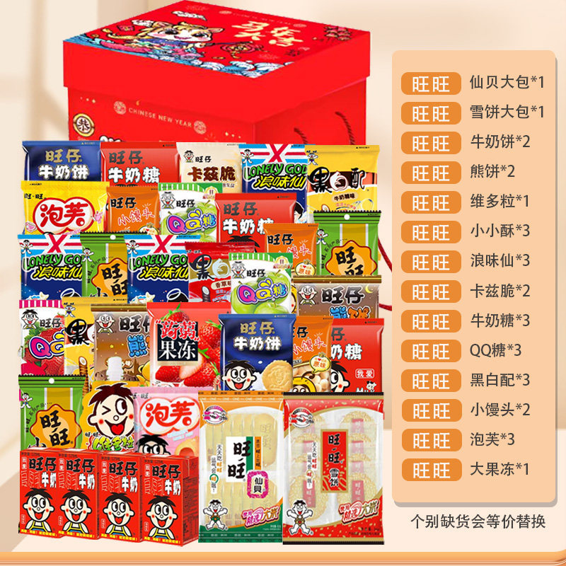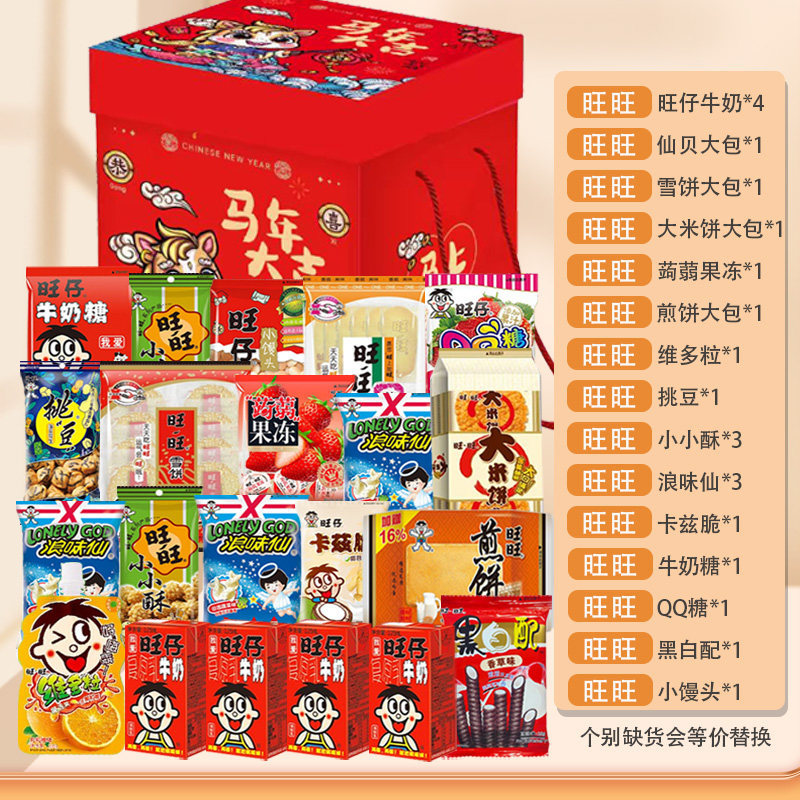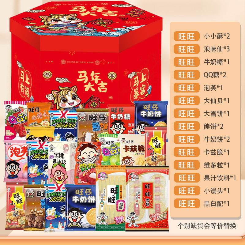 | 包装规格 | 旺旺礼盒豪华款-旺气箱礼盒 | 包装规格 | 旺旺超大全家福--马年大吉礼盒 |