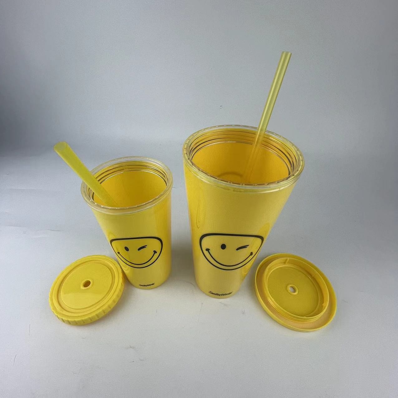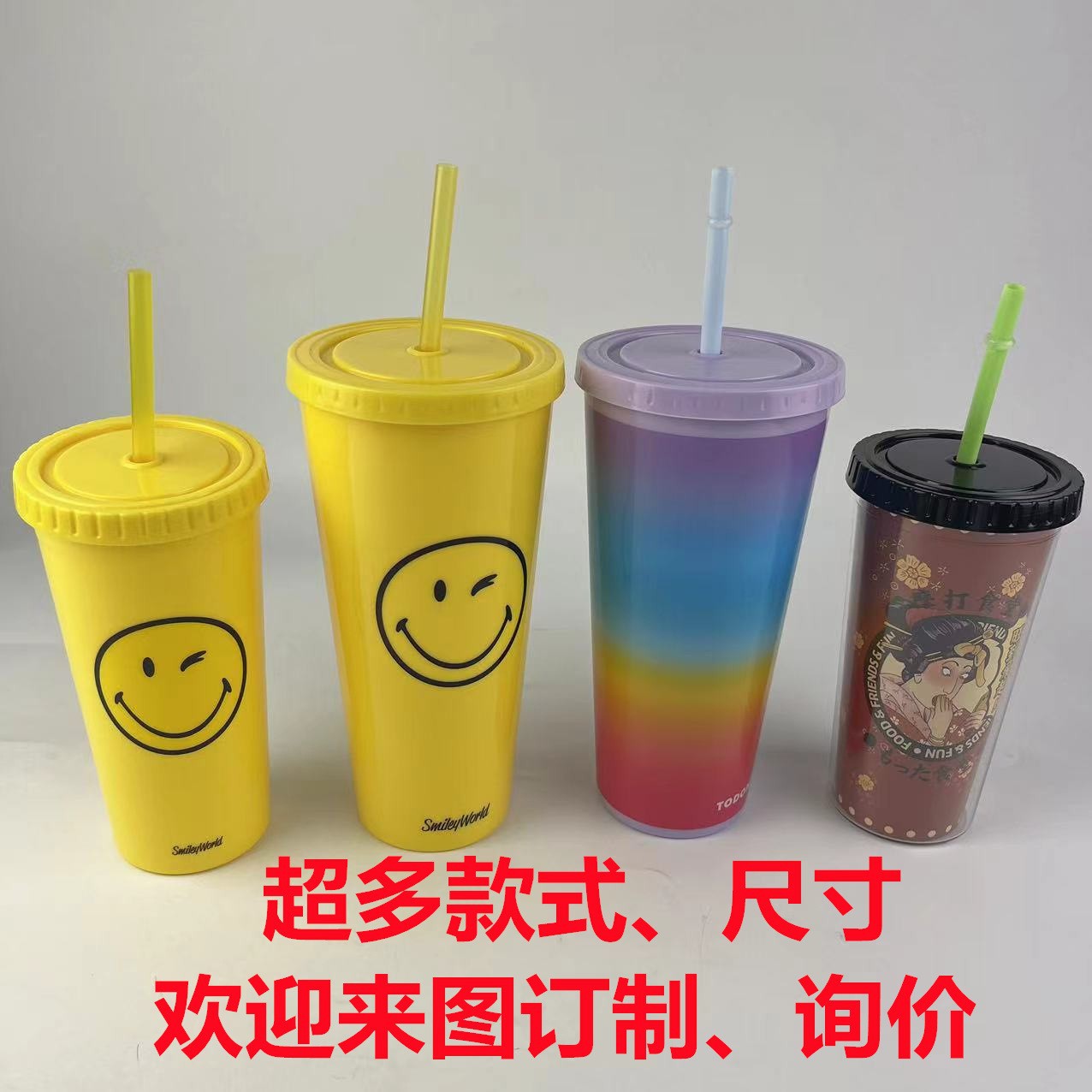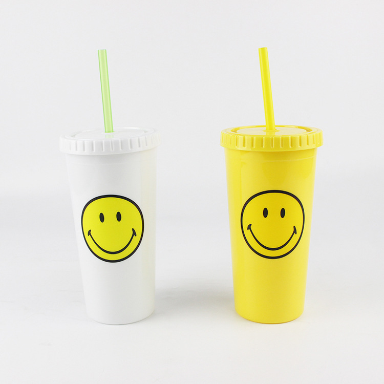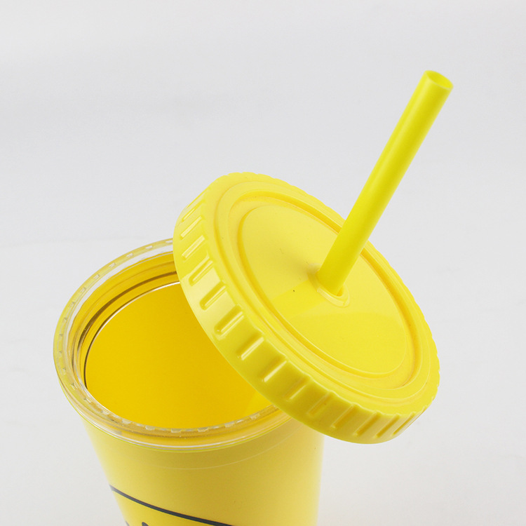 450ml卡通图案PS双层饮料杯塑料果汁杯高身吸管杯直筒杯可印花