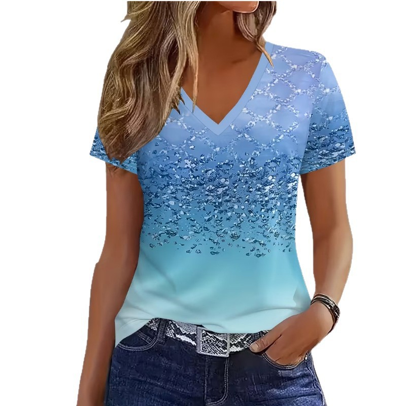春夏新款3D印花欧美渐变色V领短袖t恤时尚运动透气上衣