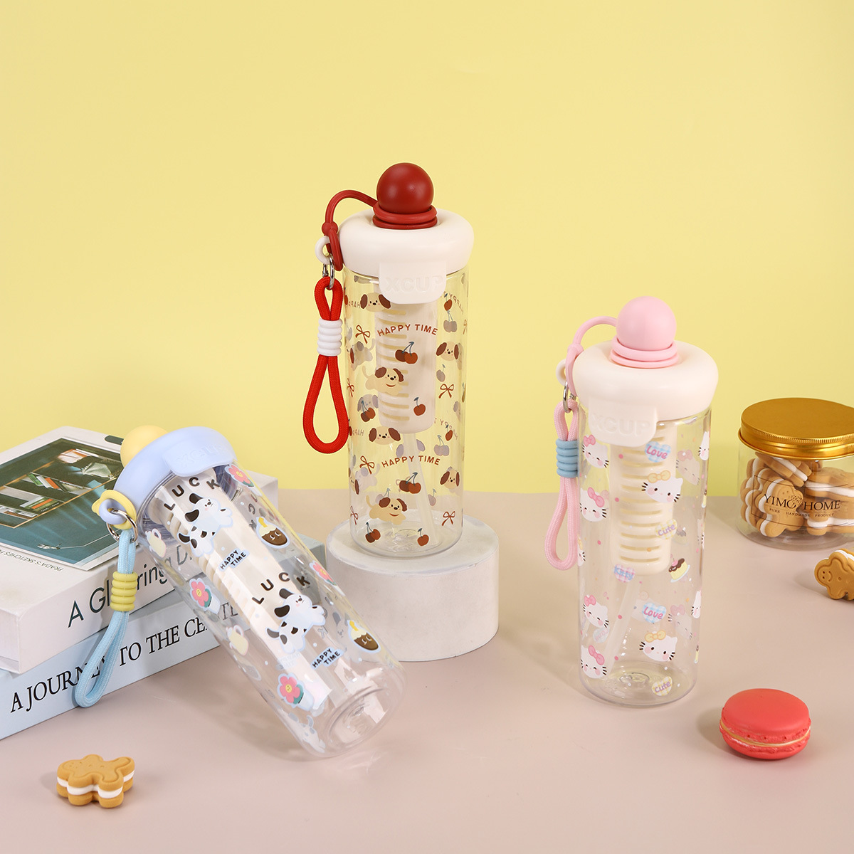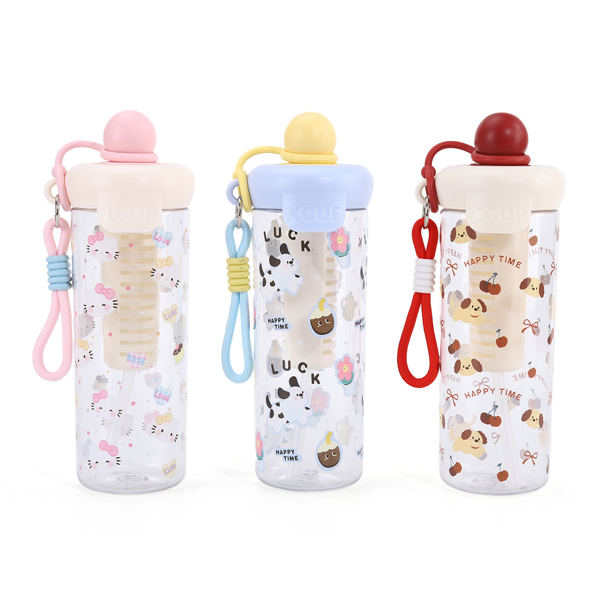 新款浮球卡通塑料杯茶水分离吸管杯防漏防摔便携带挂绳随手杯