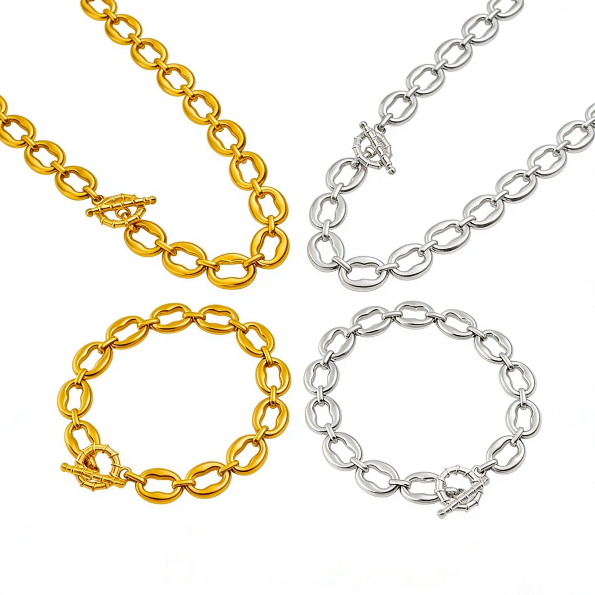 跨境热销首饰套装跨境OT扣几何金色不锈钢18K镂空复古风ins钛钢项链手链套装