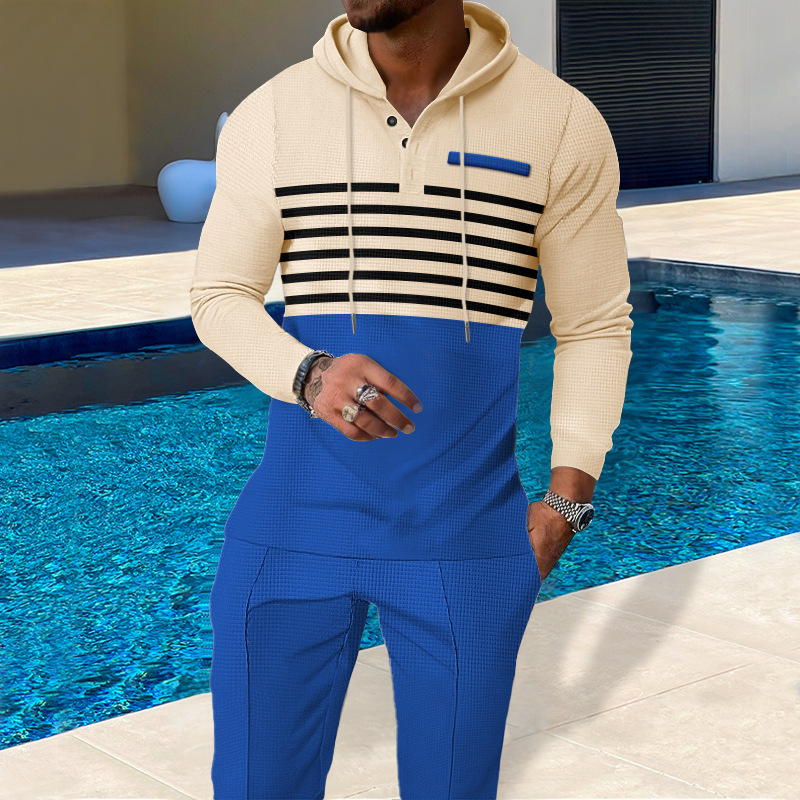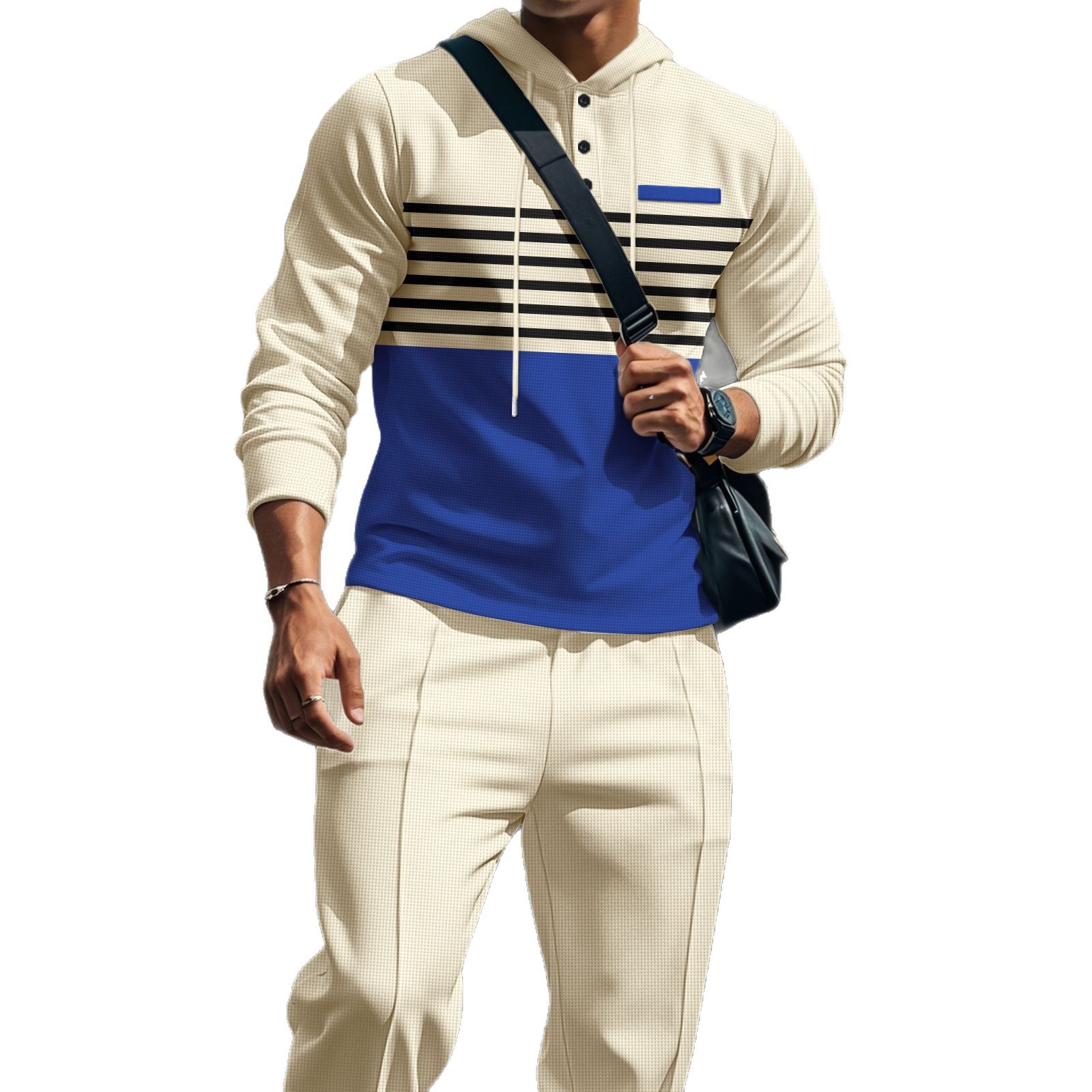 亚马逊跨境爆款欧美男士拼色长袖连帽卫衣套头亨利衫休闲长裤套装