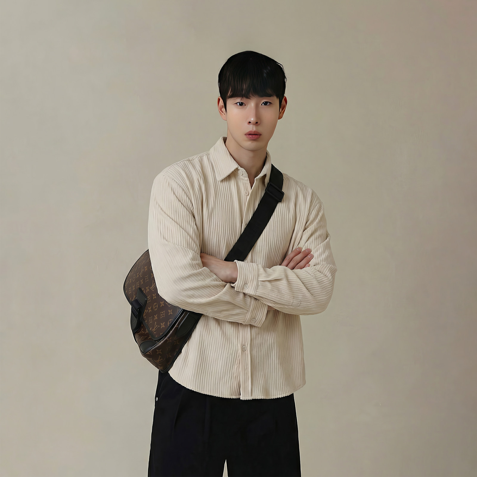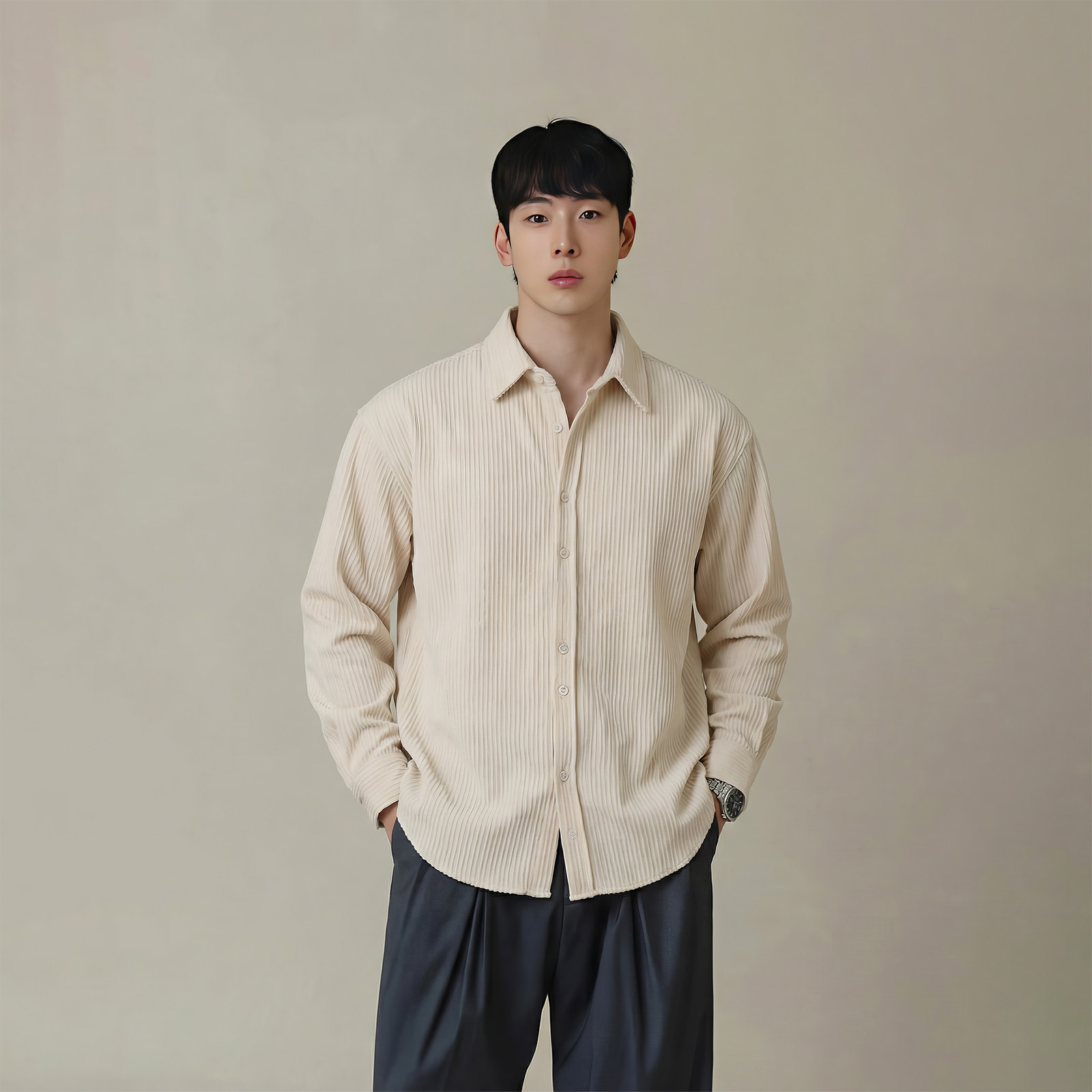 杏色肌理感条纹翻领长袖衬衫男春季轻熟老钱风人夫感商务免烫衬衣