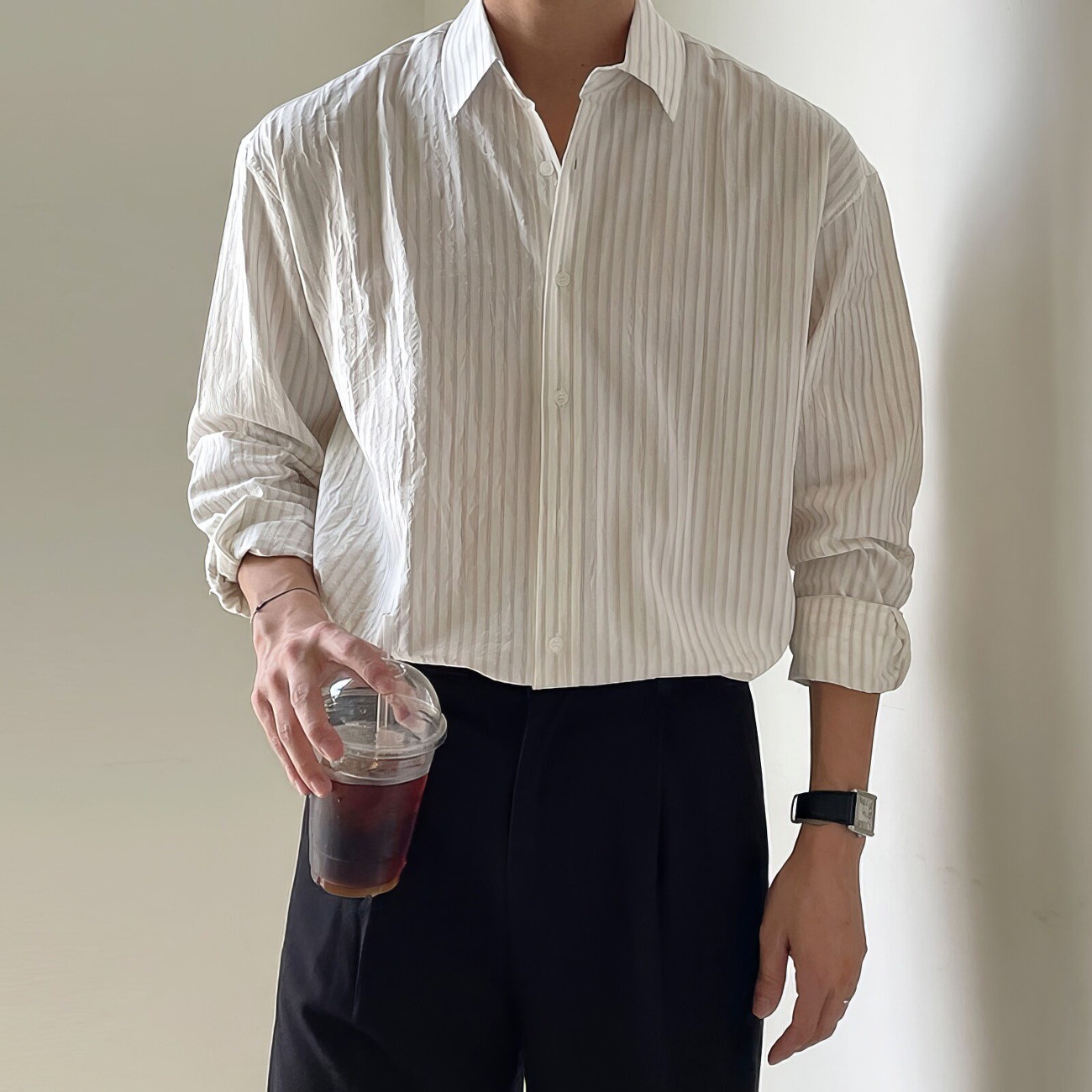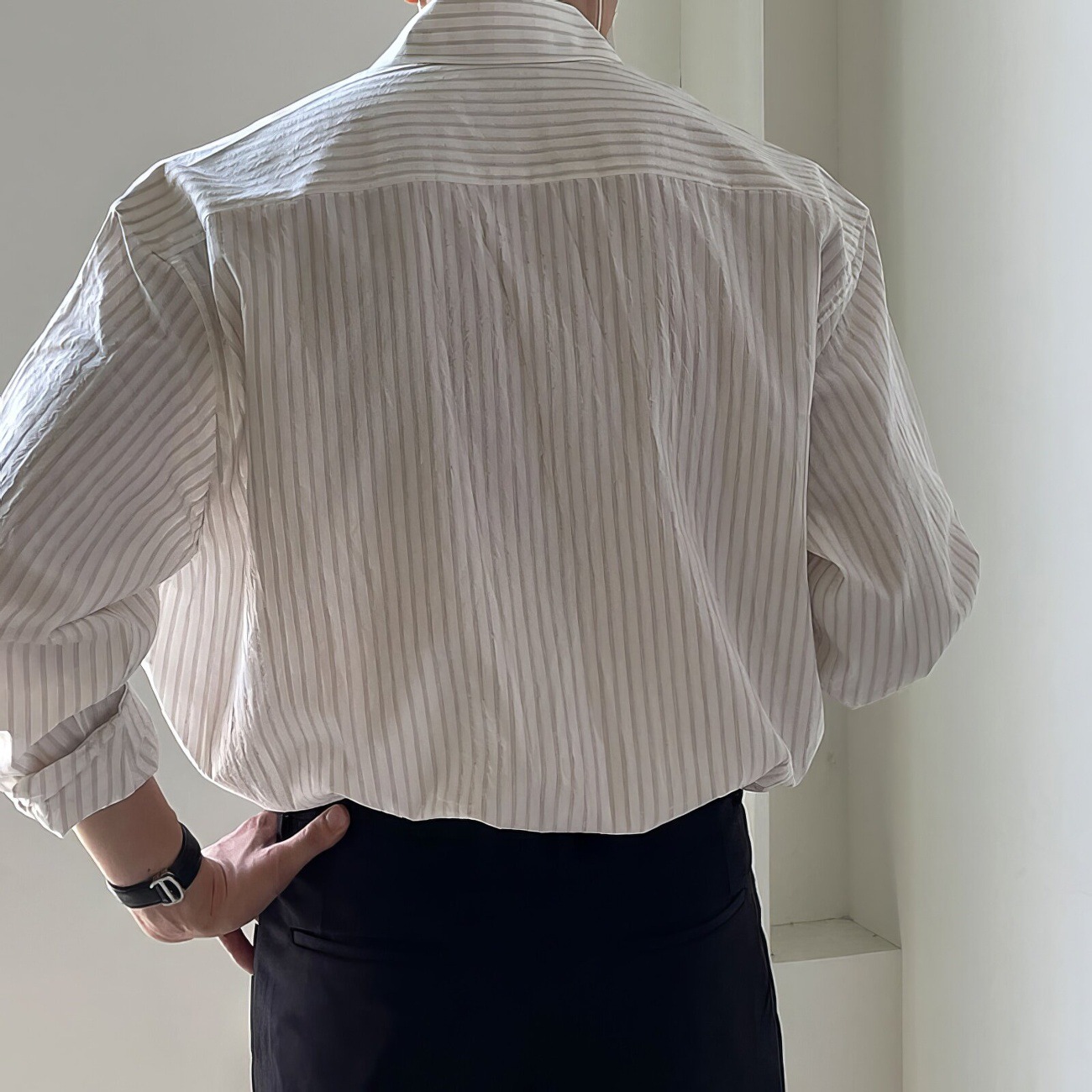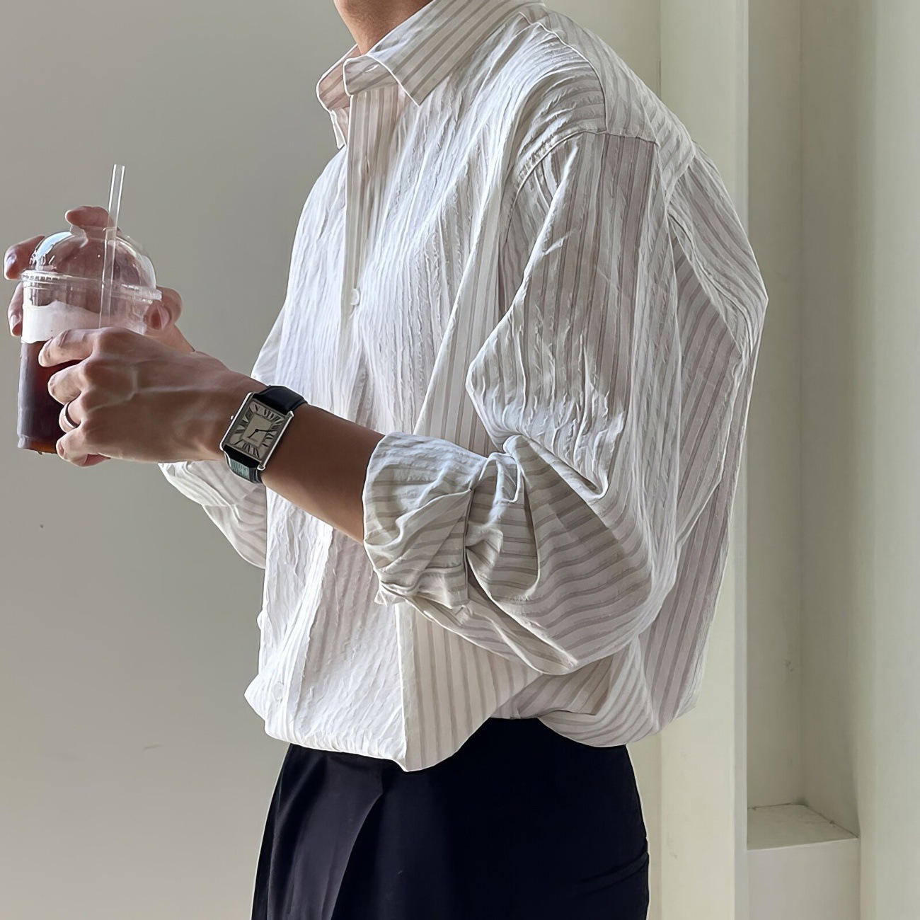 白衬衫男高级感休闲翻领小众条纹衬衣春秋季时尚百搭薄款长袖外套