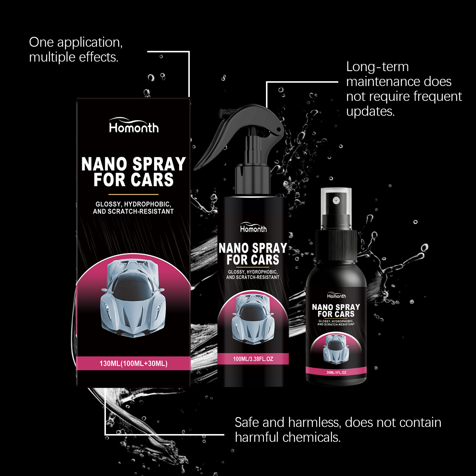 | 类型 | 纳米涂层喷雾 | 主要成分 | 水、 改性氨基硅油高分子聚合物、 乙烯共聚物、 1,2-己二醇、 EDTA-2Na |