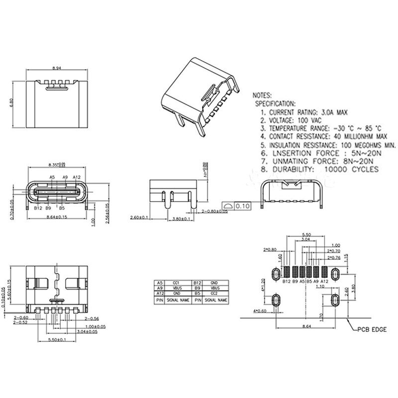 type-c母座6P卧式四脚插3A快充连接器16P贴片板上型typec充电母座