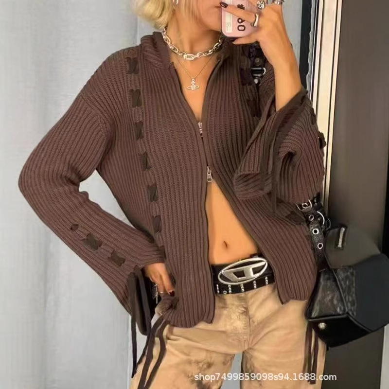 2025欧美女装跨境秋冬重工手编穿绳复古风连帽开衫长袖毛衣外套