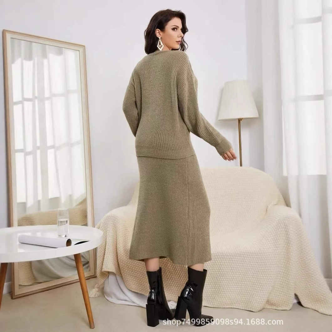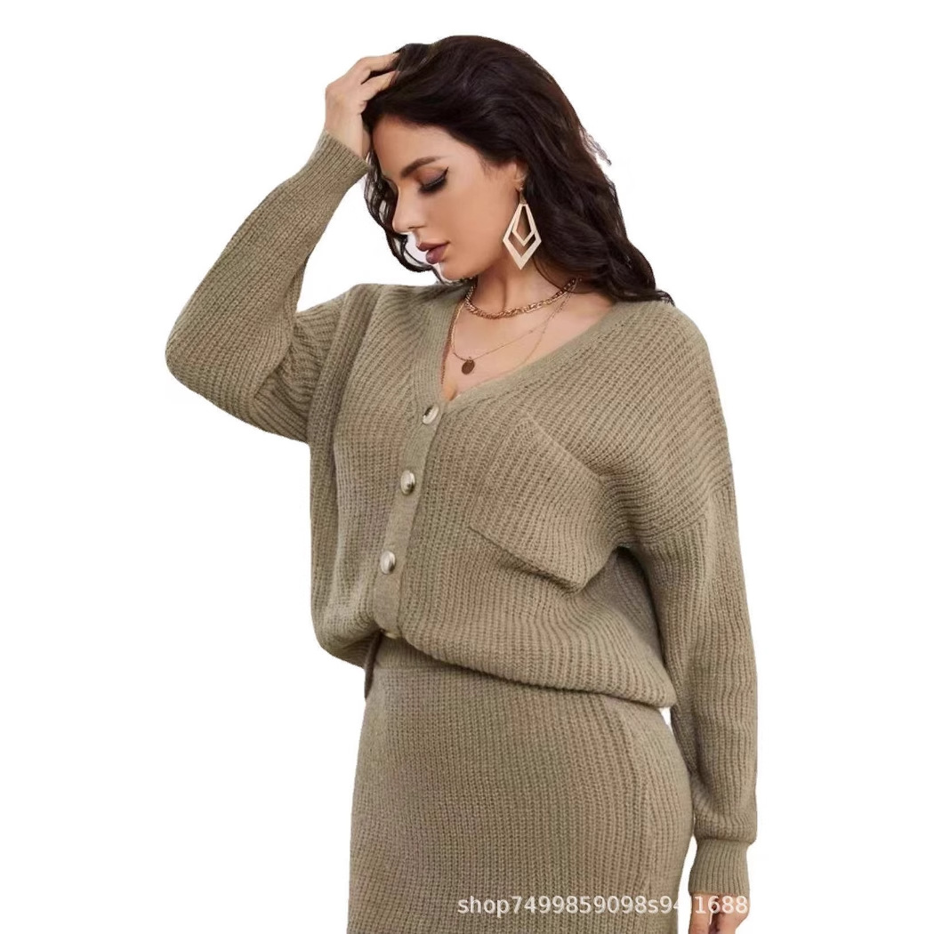 欧美跨境套装纯色开胸毛衣裙子俩件套装长款百搭