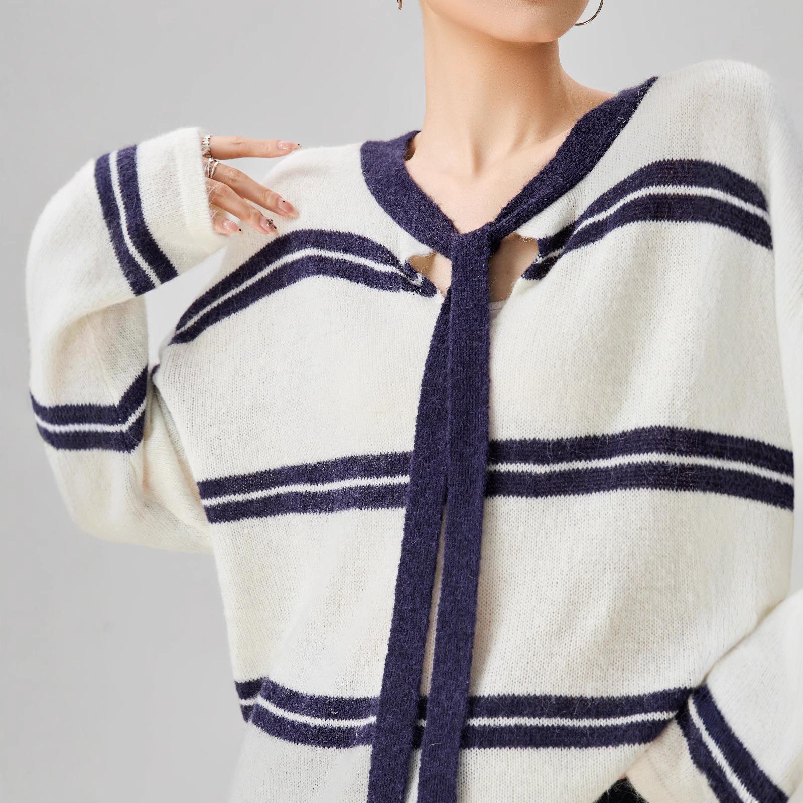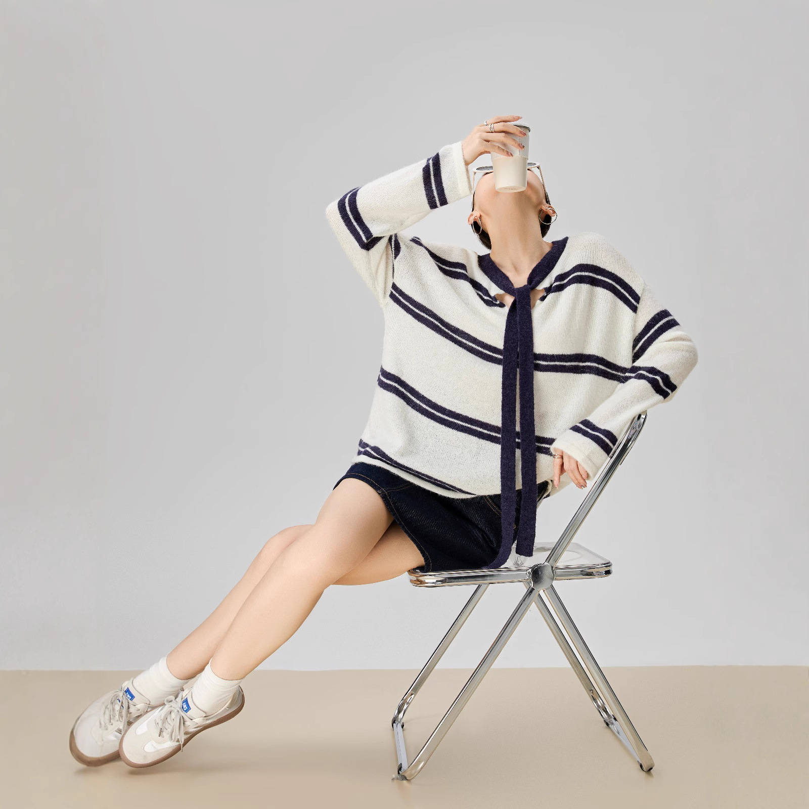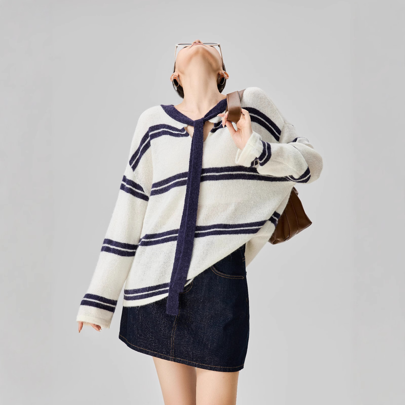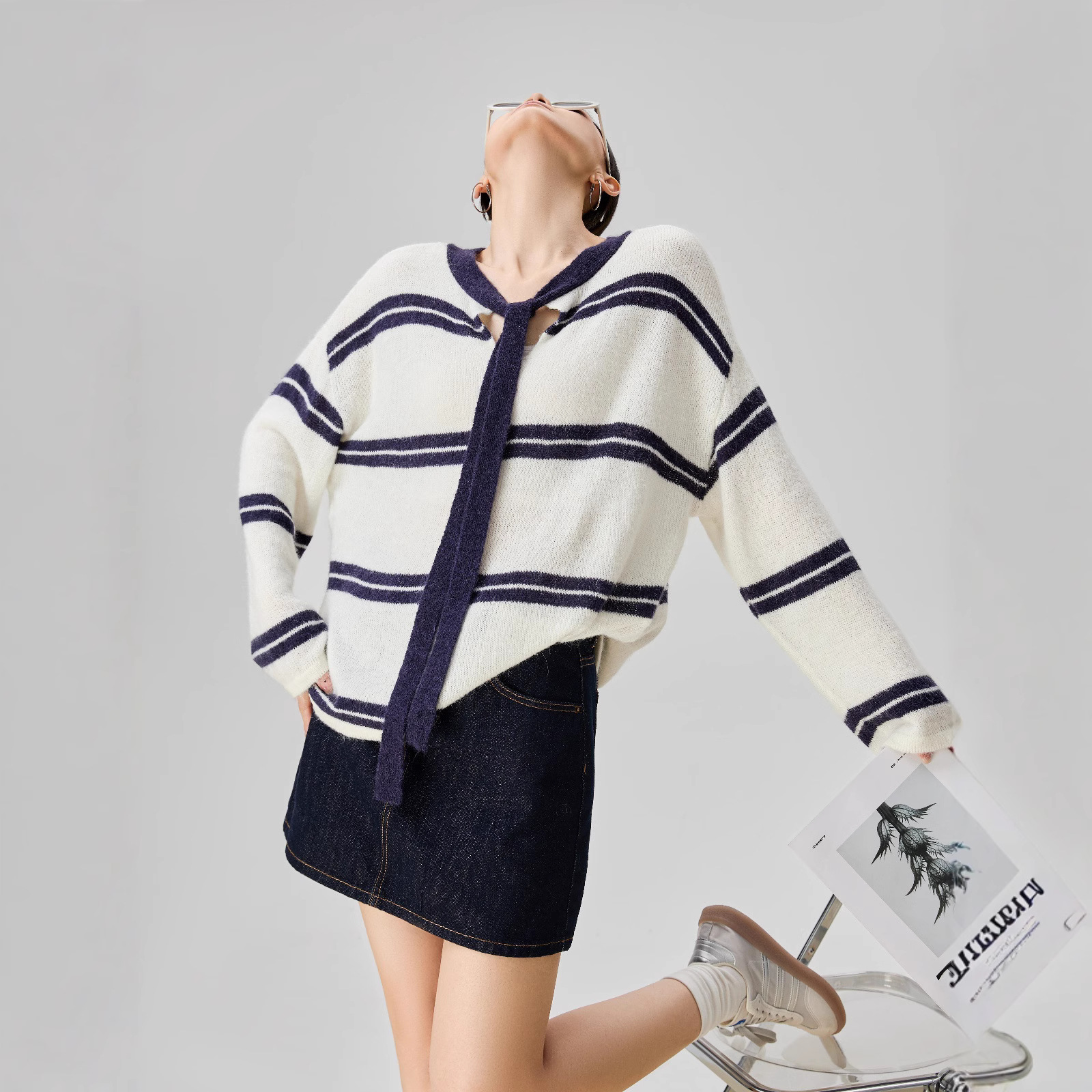 前后两穿马海毛撞色条纹系带长袖针织衫上衣女韩系早秋季穿搭小众