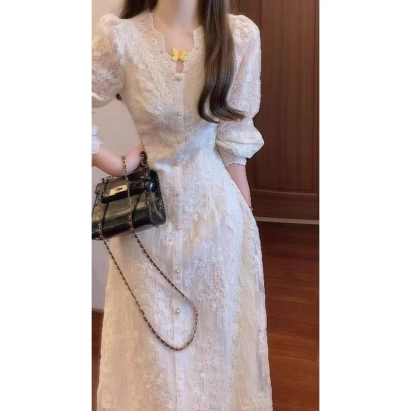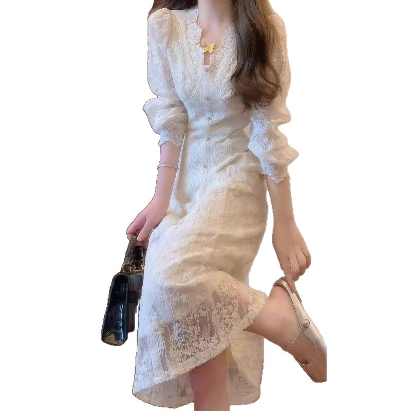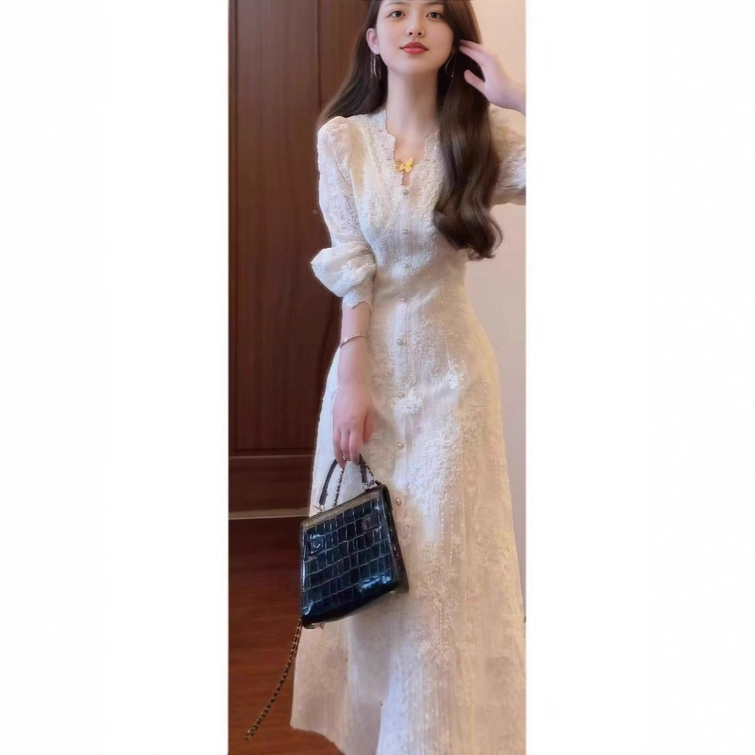 2025秋季法式甜美温柔风白色蕾丝连衣裙长袖收腰气质长裙显瘦新款