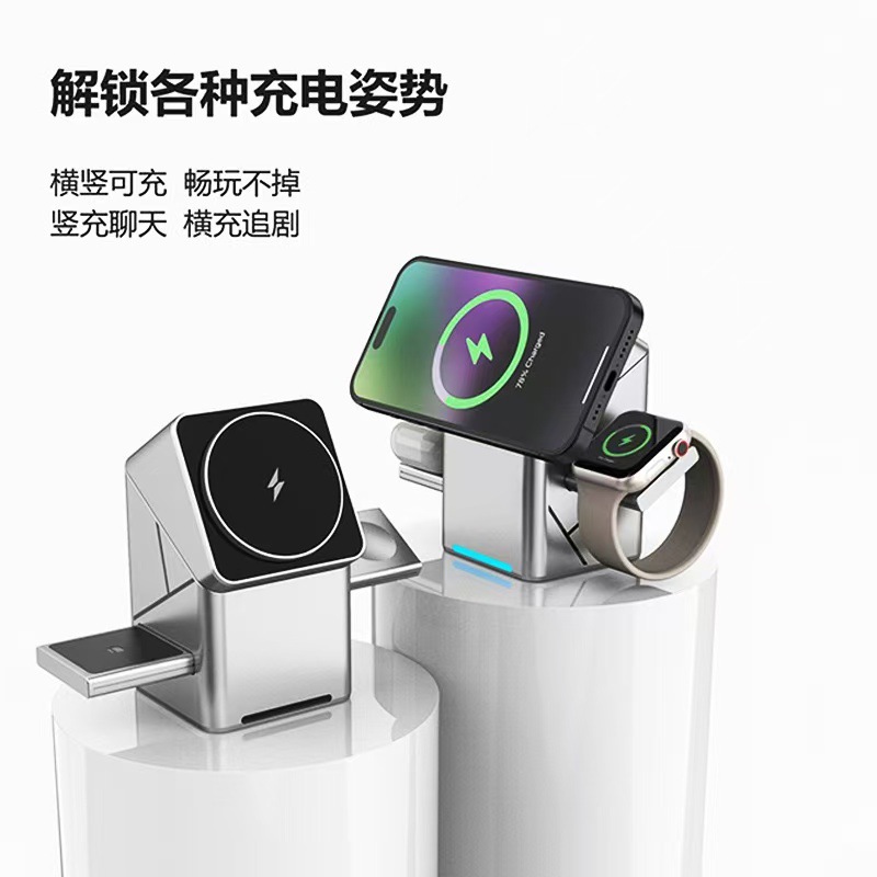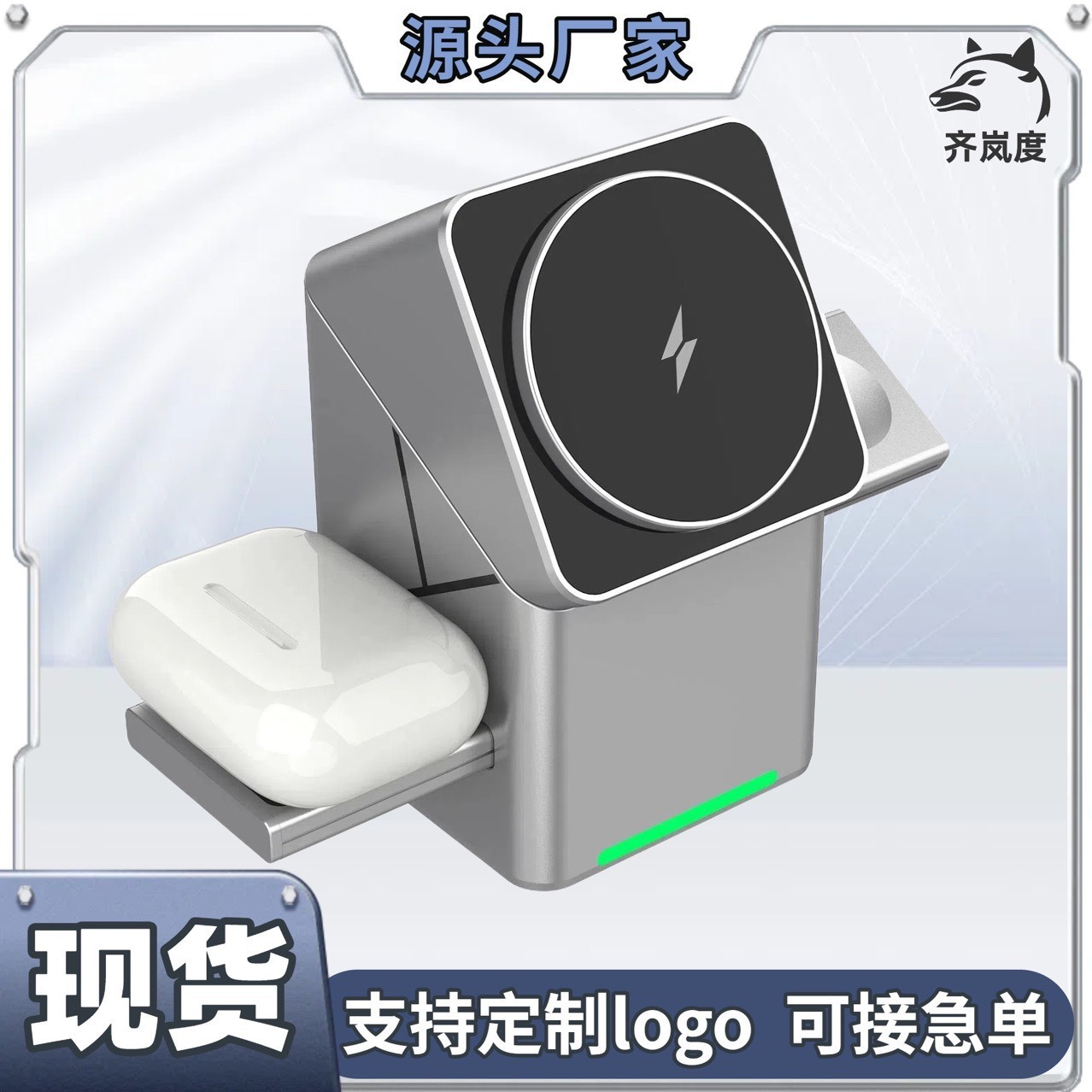 R28旋转三合一磁吸魔方无线充电器适用苹果15手表快充手机支架