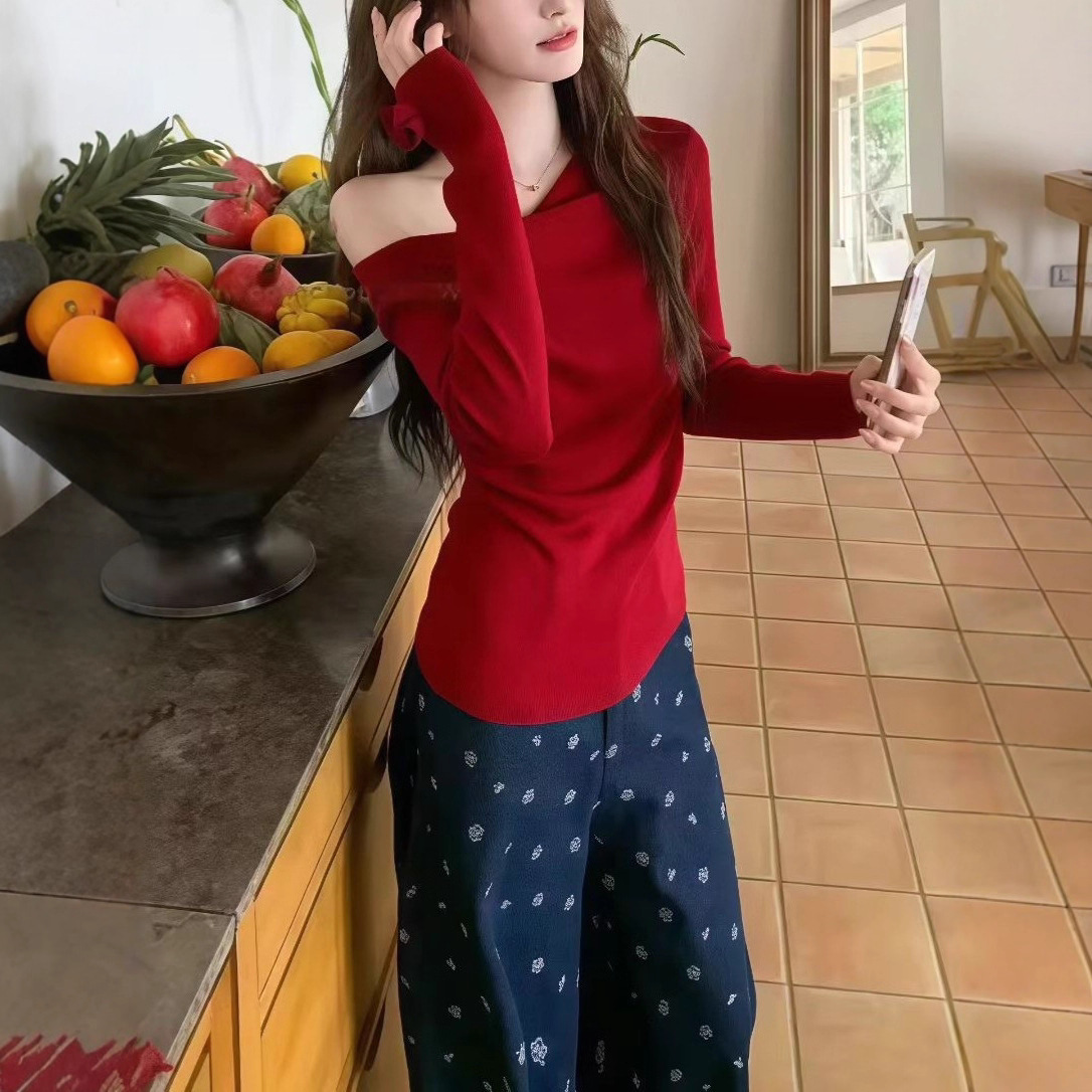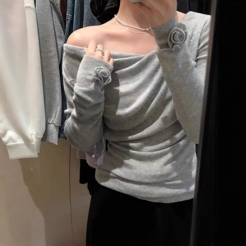 早秋白色立体花朵荡领露肩羊毛针织衫女春秋冬羊绒内搭打底衫上衣