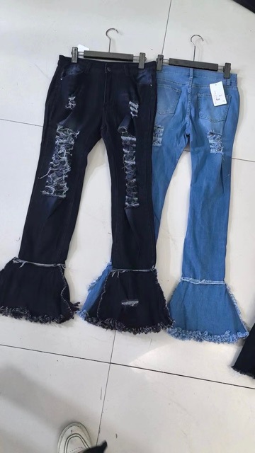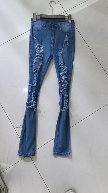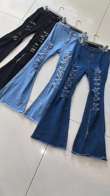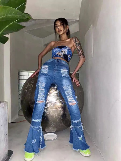 时尚高腰新款现代喇叭剪裁撕裂牛仔裤女性感提臀紧身弹力牛仔裤女