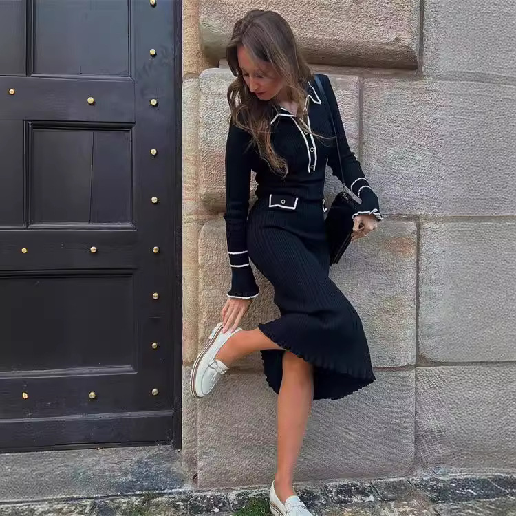 爆款!欧美新款亚马逊法式轻奢荷叶边针织秋冬毛衣翻领紧身连衣裙