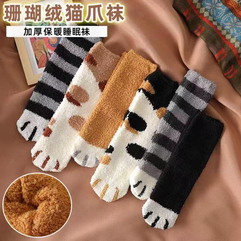 | 新工艺不掉毛 | 珊瑚绒中筒袜子女冬天加厚保暖卡通猫爪袜甜美地板袜月子睡眠袜子 |