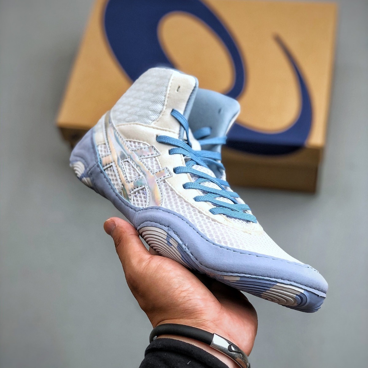 颜色深白蓝摔跤训练鞋