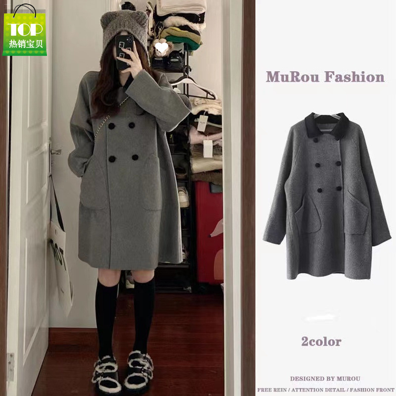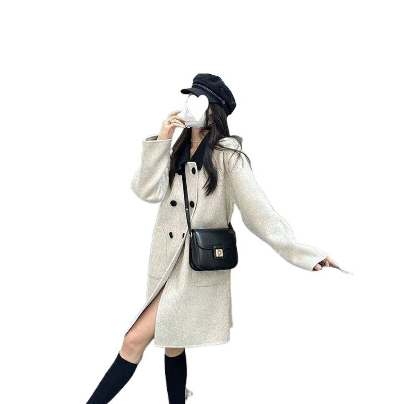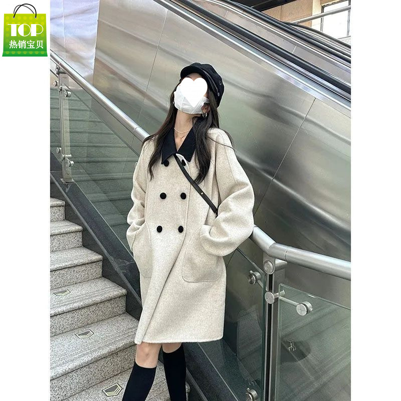 2025秋冬韩版撞色翻领气质高级感外套呢子中长款赫本风毛呢大衣女