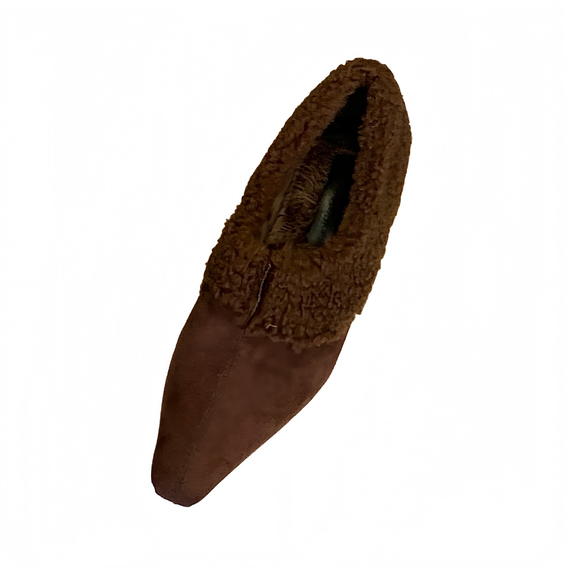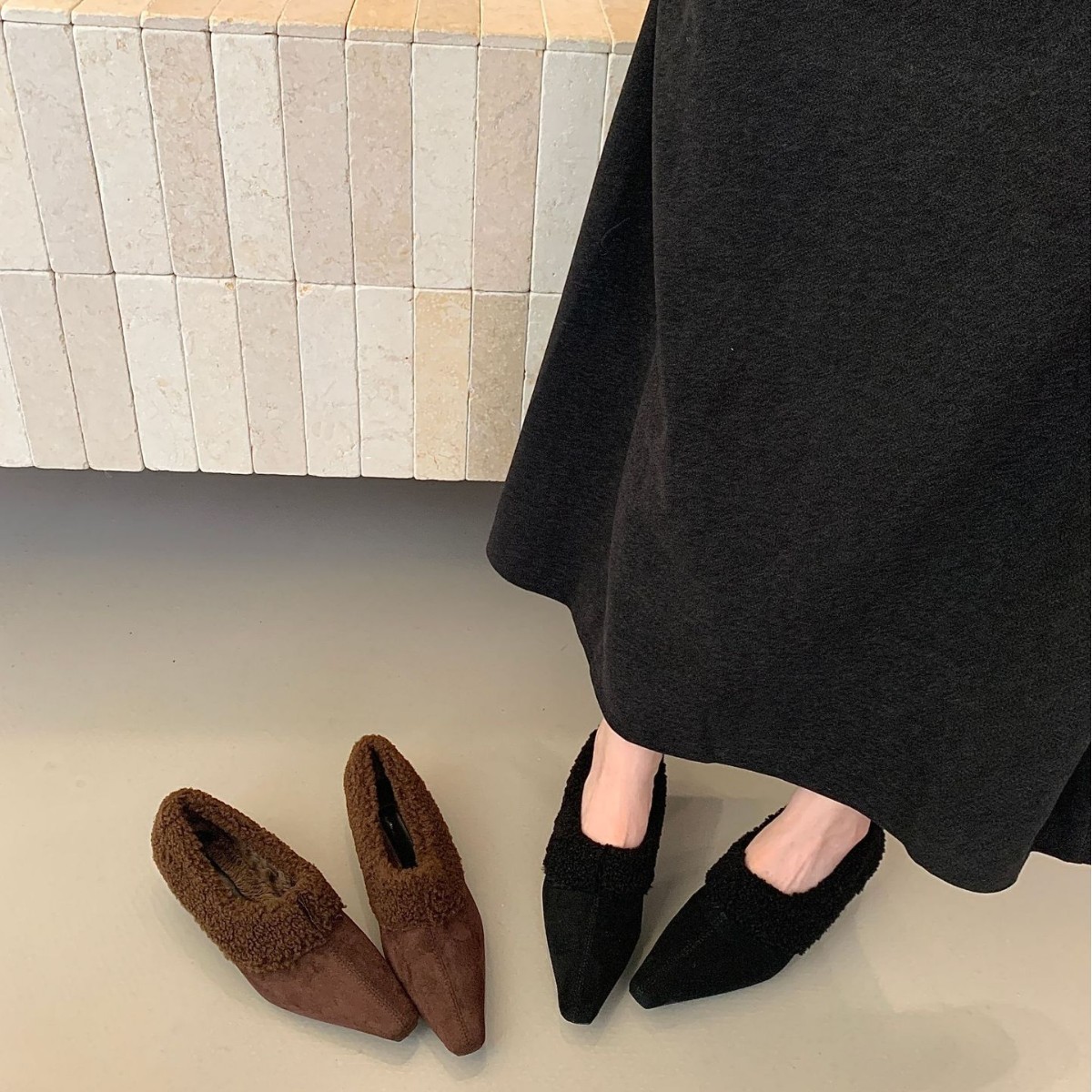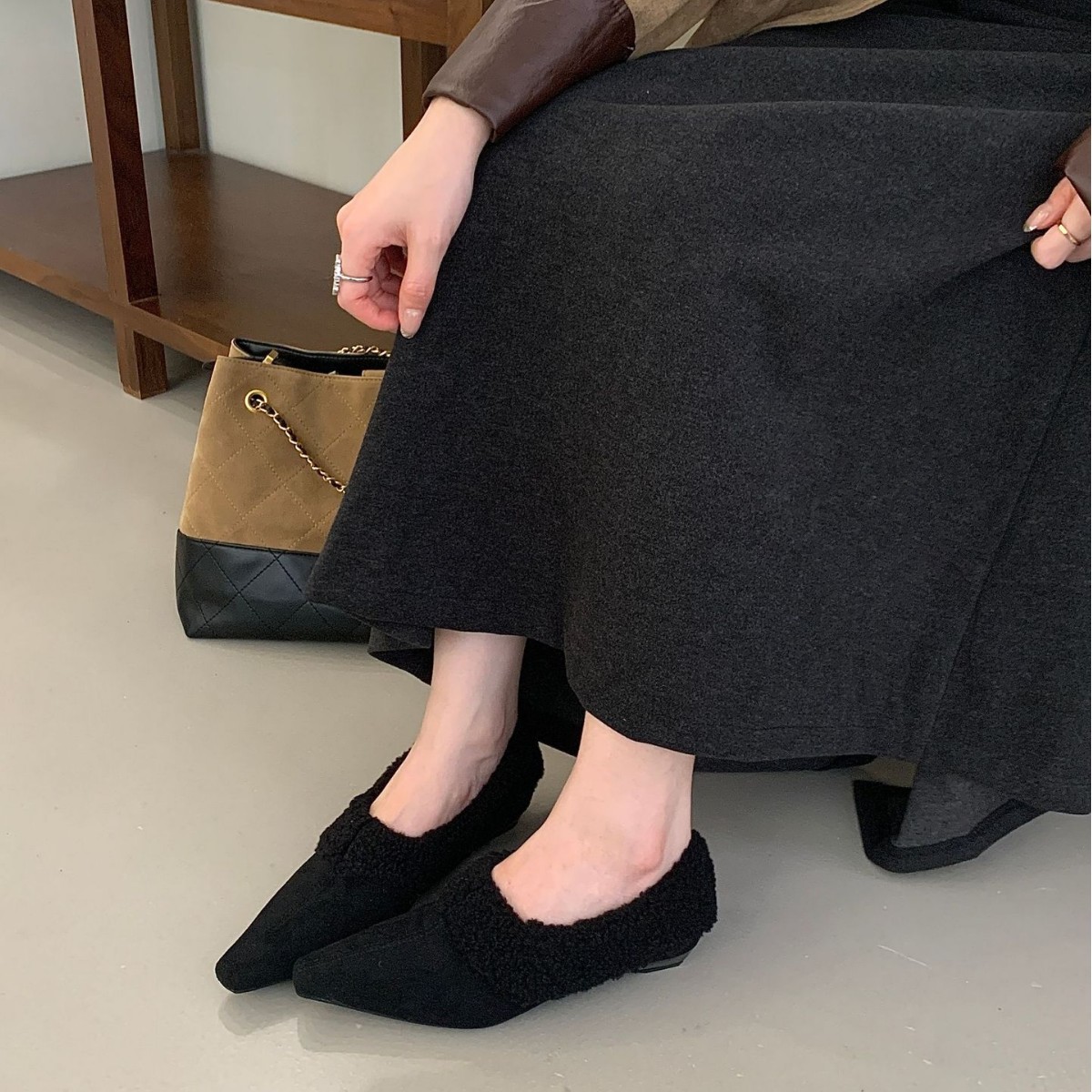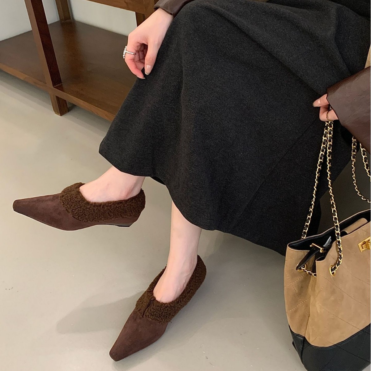 毛毛鞋2025秋冬新款坡跟百搭复古风尖头加绒保暖毛毛鞋深口女单鞋