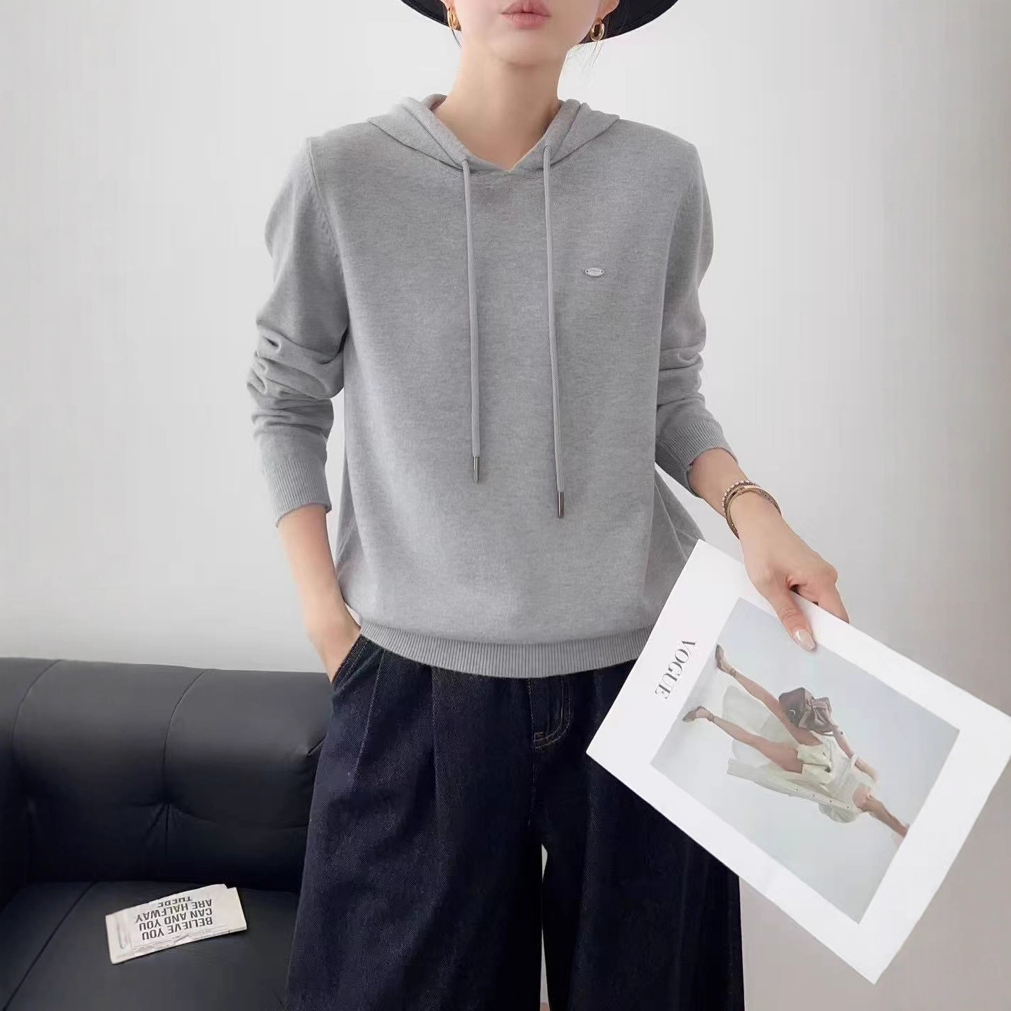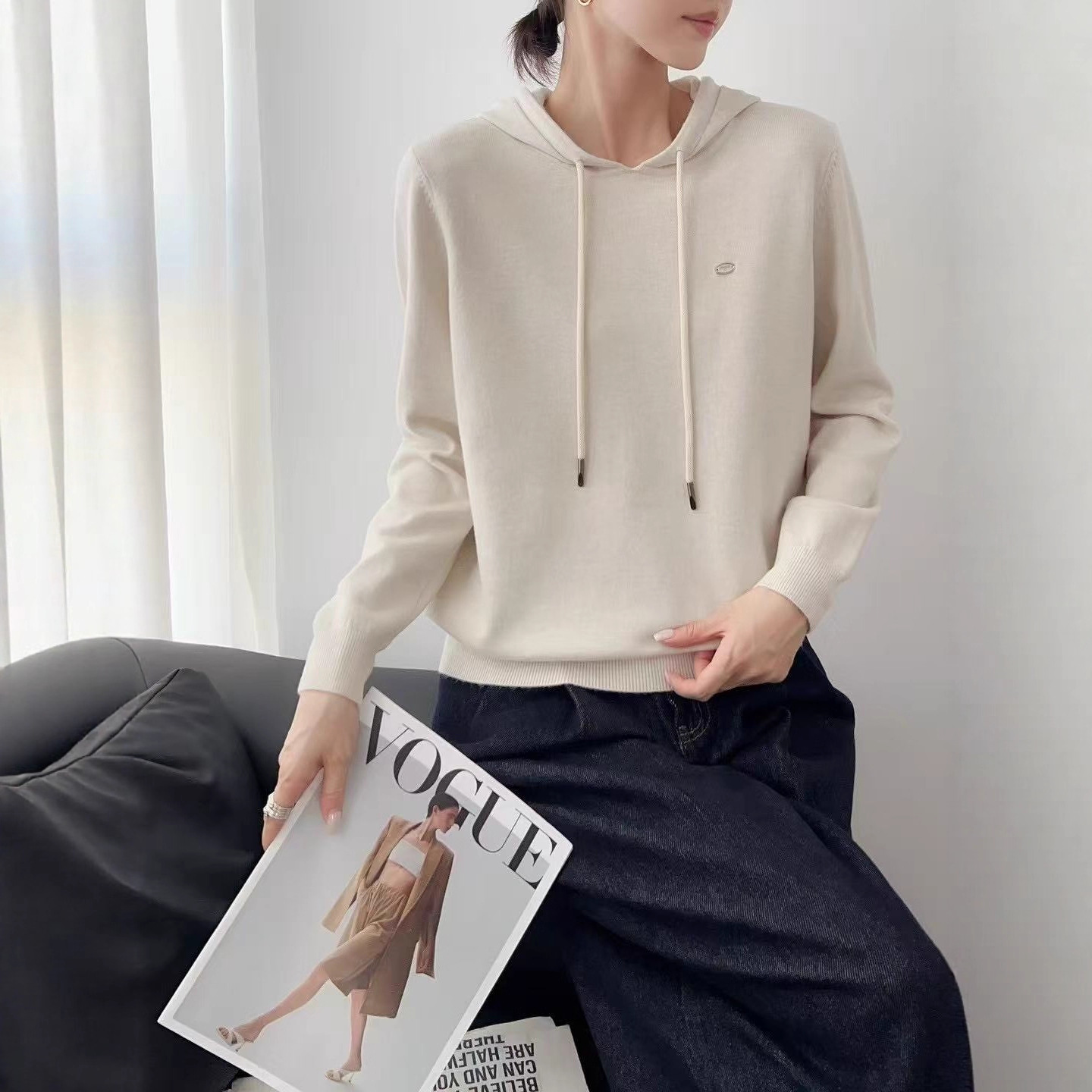 Wu敌软糯细腻连帽羊绒长袖针织衫2025新款抗起球休闲百搭衫