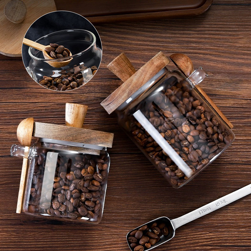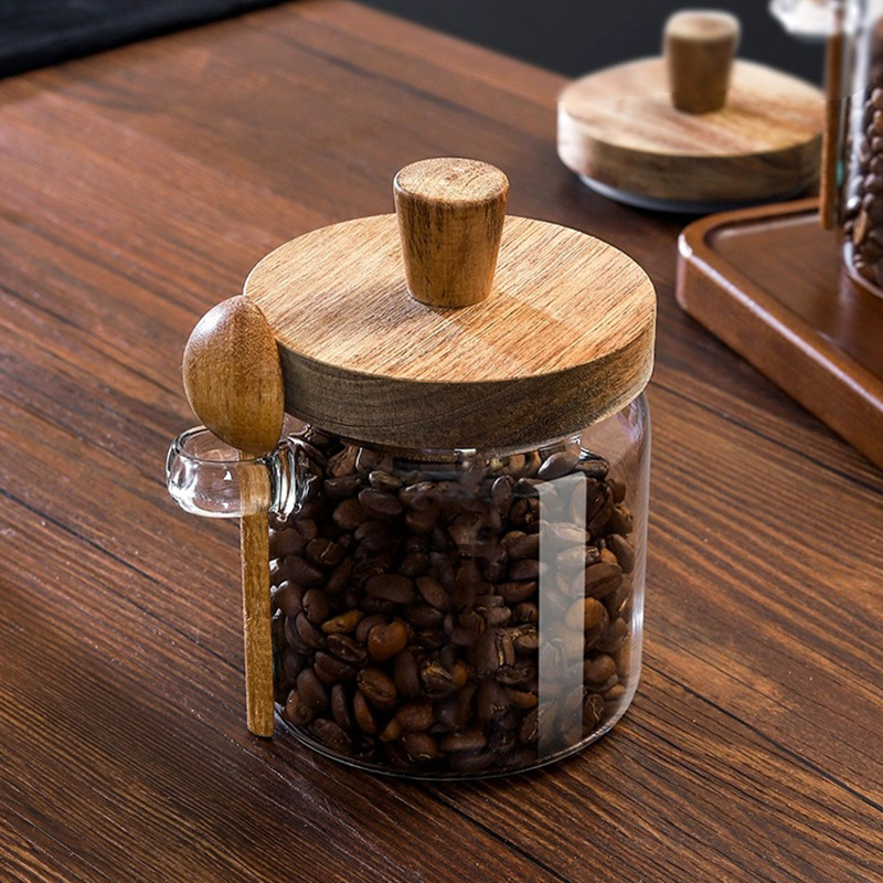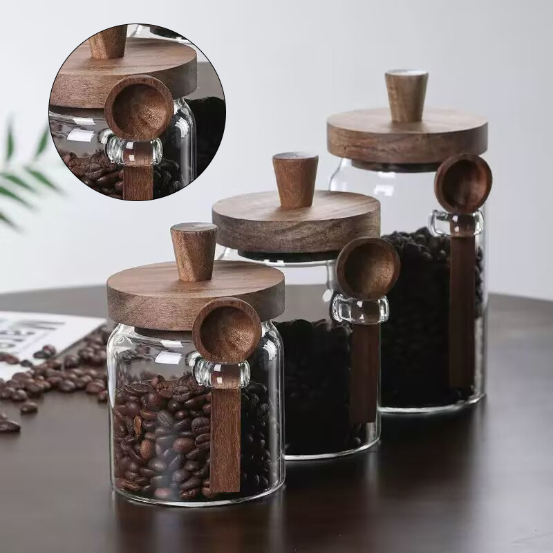带勺储物罐相思木盖透明玻璃密封罐茶叶罐咖啡豆储存罐家用茶叶罐