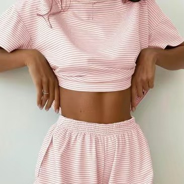 2025欧美秋季针织条纹睡衣宽松短袖短裤套装时尚跨境外穿家居服女