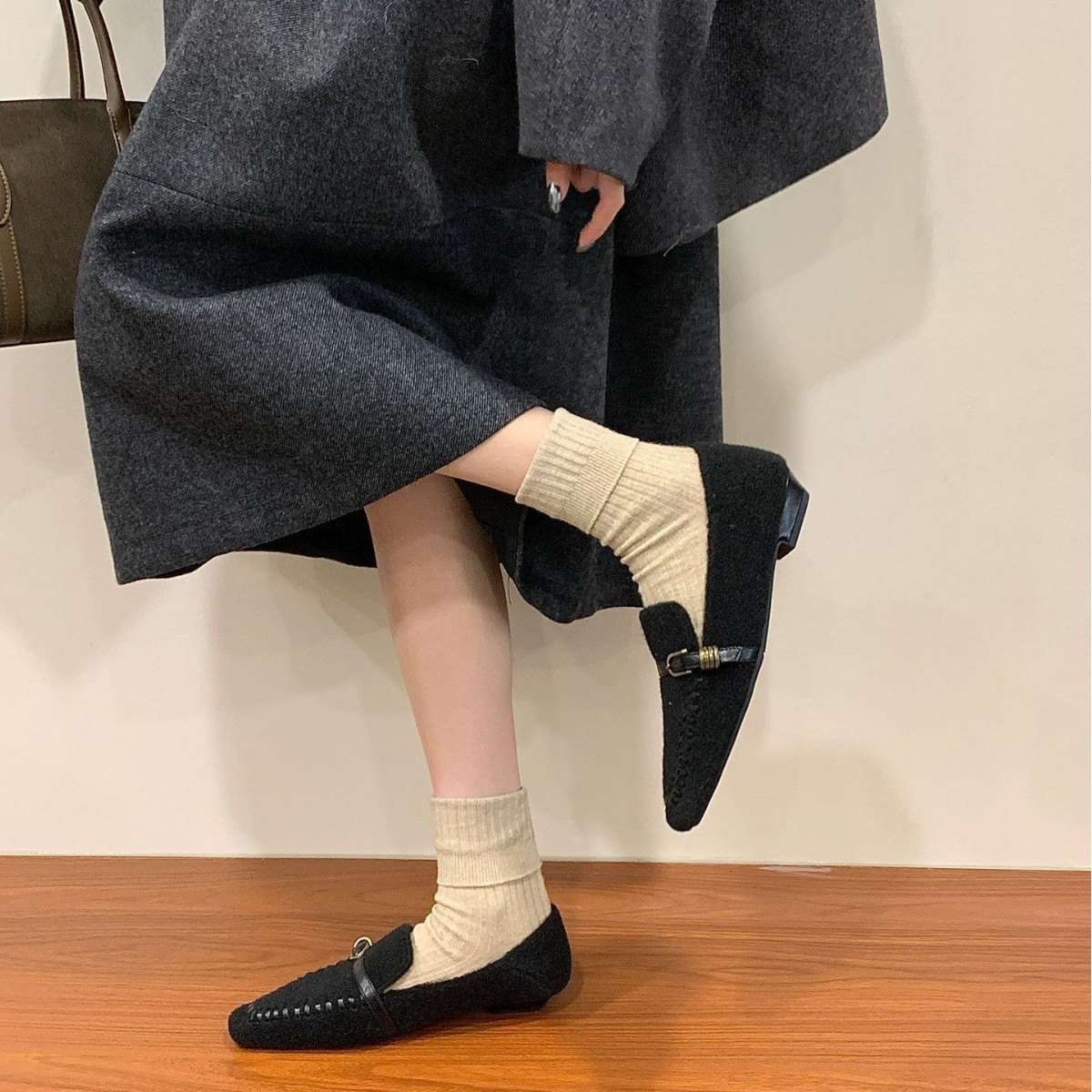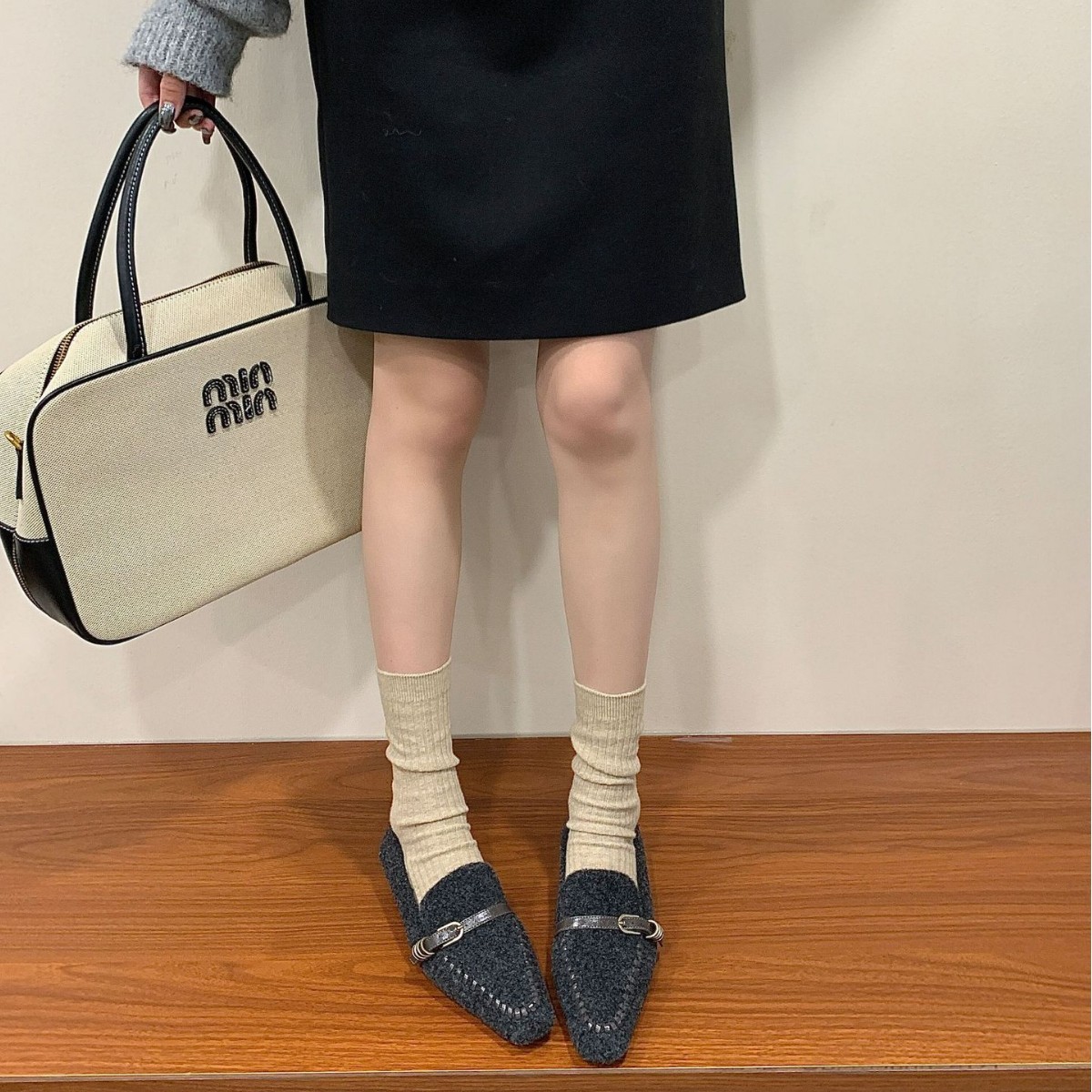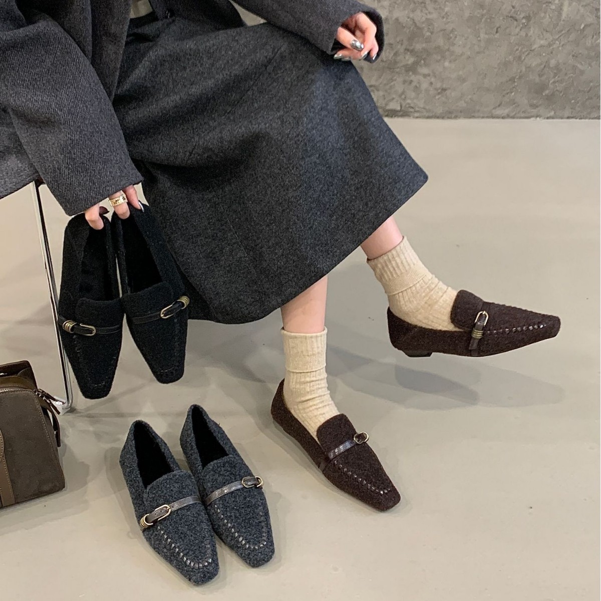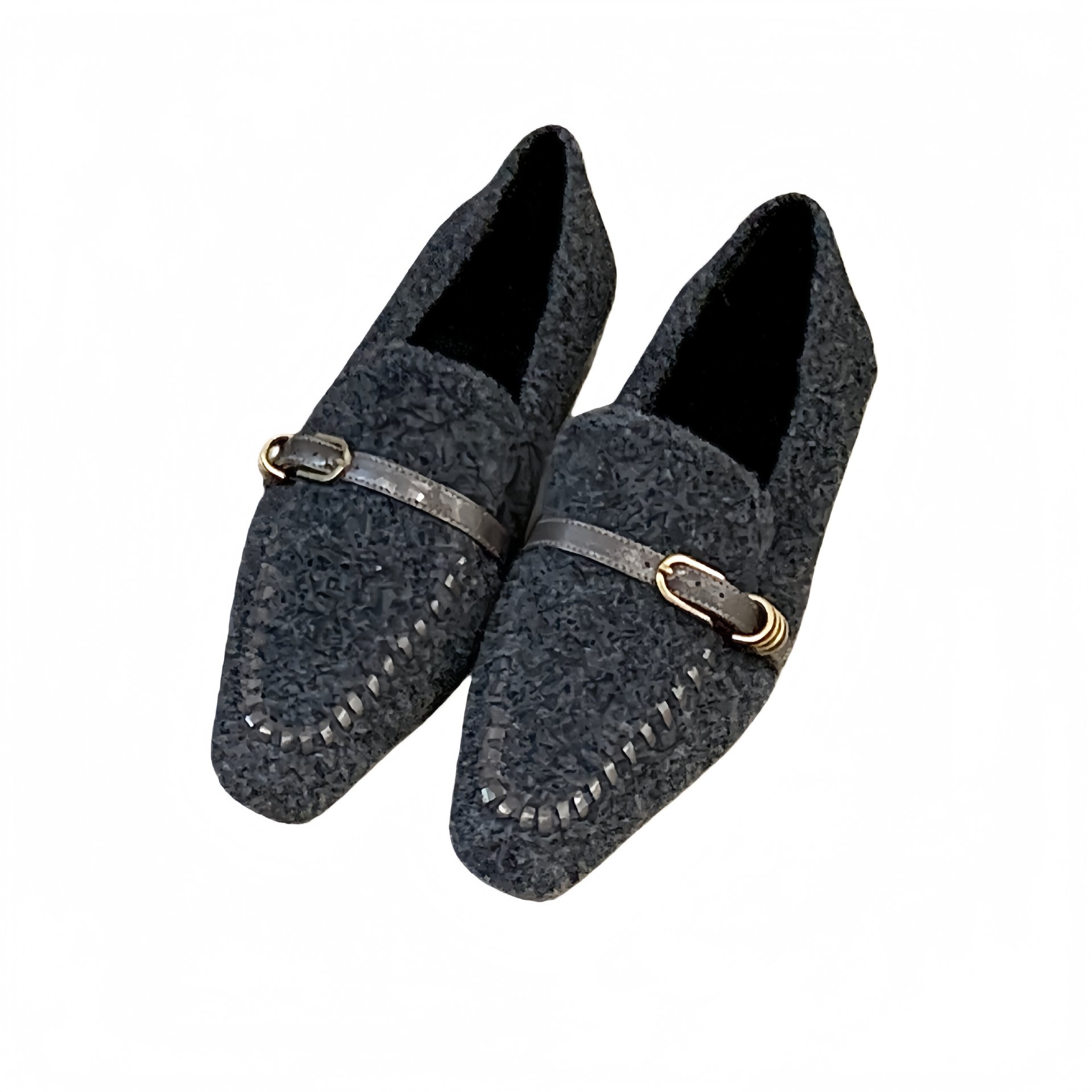 2025秋冬方头加绒保暖法式毛毛鞋一字带深口坡跟时尚舒适通勤棉鞋