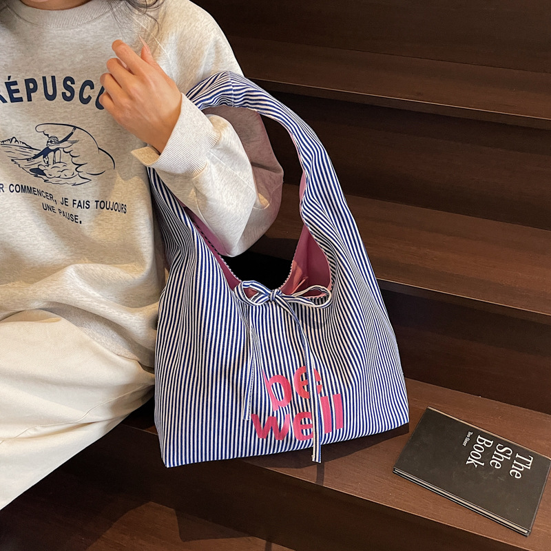 韩国大容量托特正反双面条纹休闲单肩刺绣帆布包学生通勤手提格纹