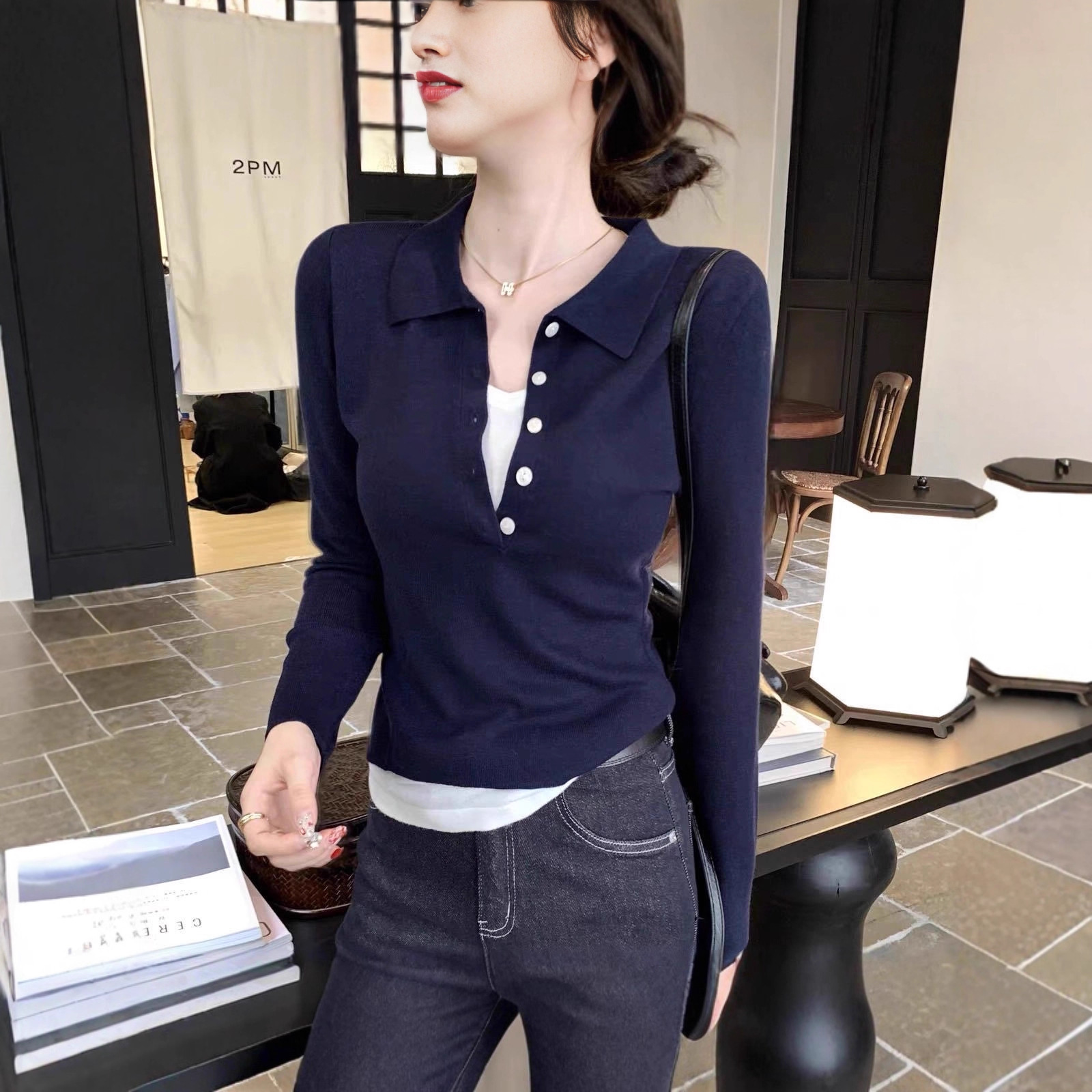 假两件拼接polo领长袖针织衫女秋季修身显瘦设计感撞色打底衫上衣