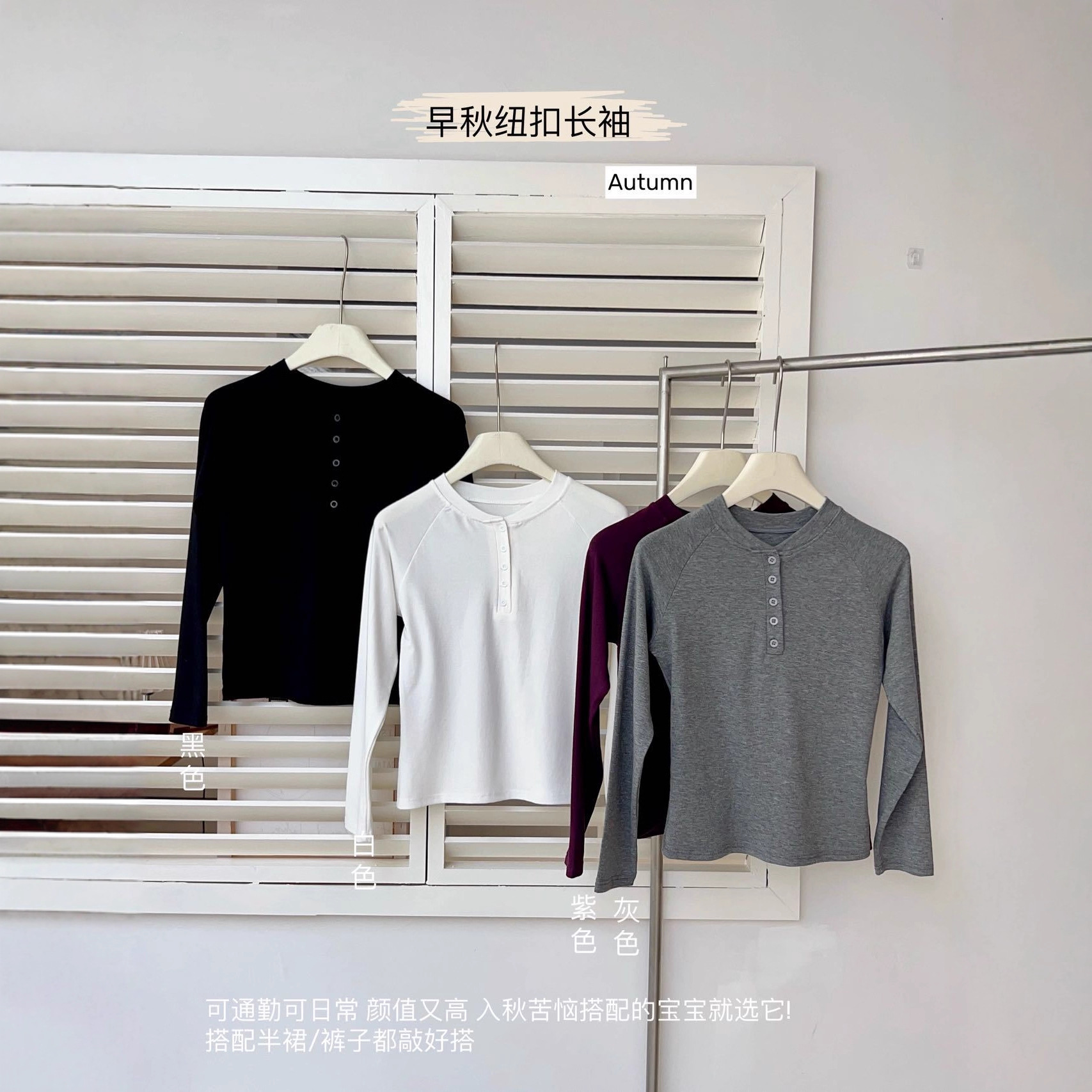 韩版花灰色纽扣插肩长袖T恤女秋季2025新款纯棉内搭修身短款上衣