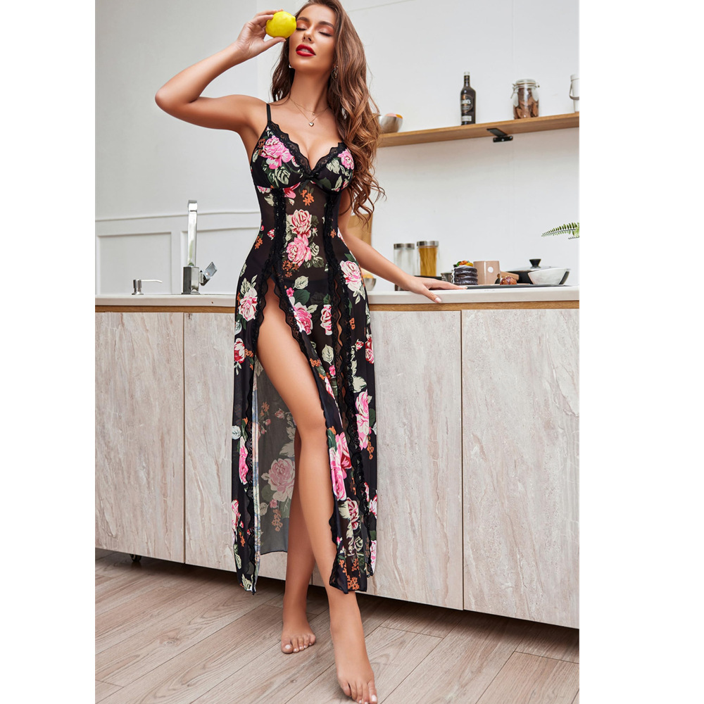 2025新款跨境情趣睡衣 性感诱惑吊带蕾丝拼接开叉印花长裙带丁裤