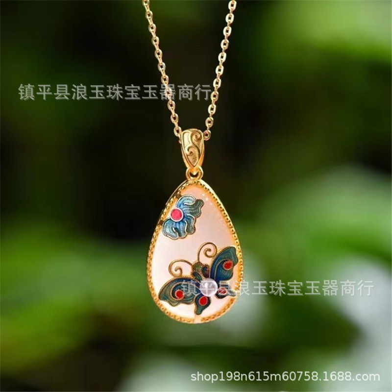 天然玉石新疆金丝玉羊脂白景泰蓝镶嵌水滴吊坠直播货源