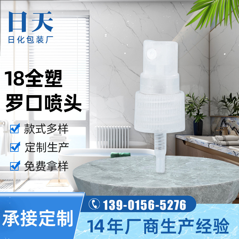 厂家批发18全塑罗口喷头按压式喷雾头乳液泵化妆品香水PP塑料全罩