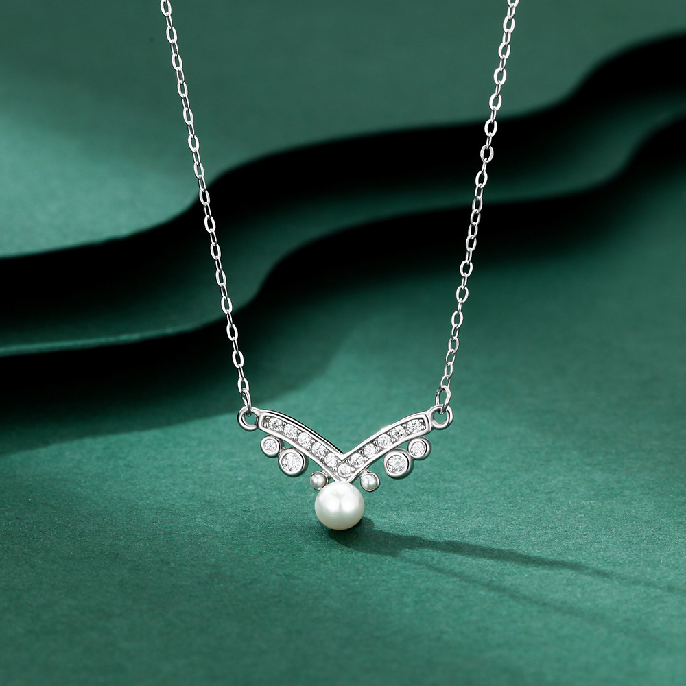 s999纯银吊坠锆石项链女款V形珍珠项链银吊坠锁骨链跨境外贸礼物