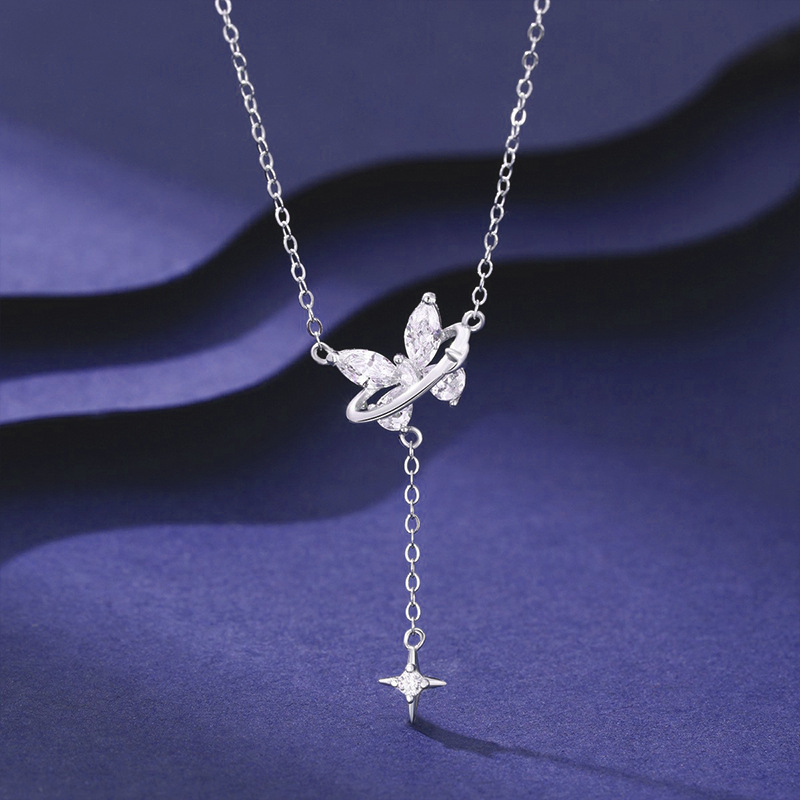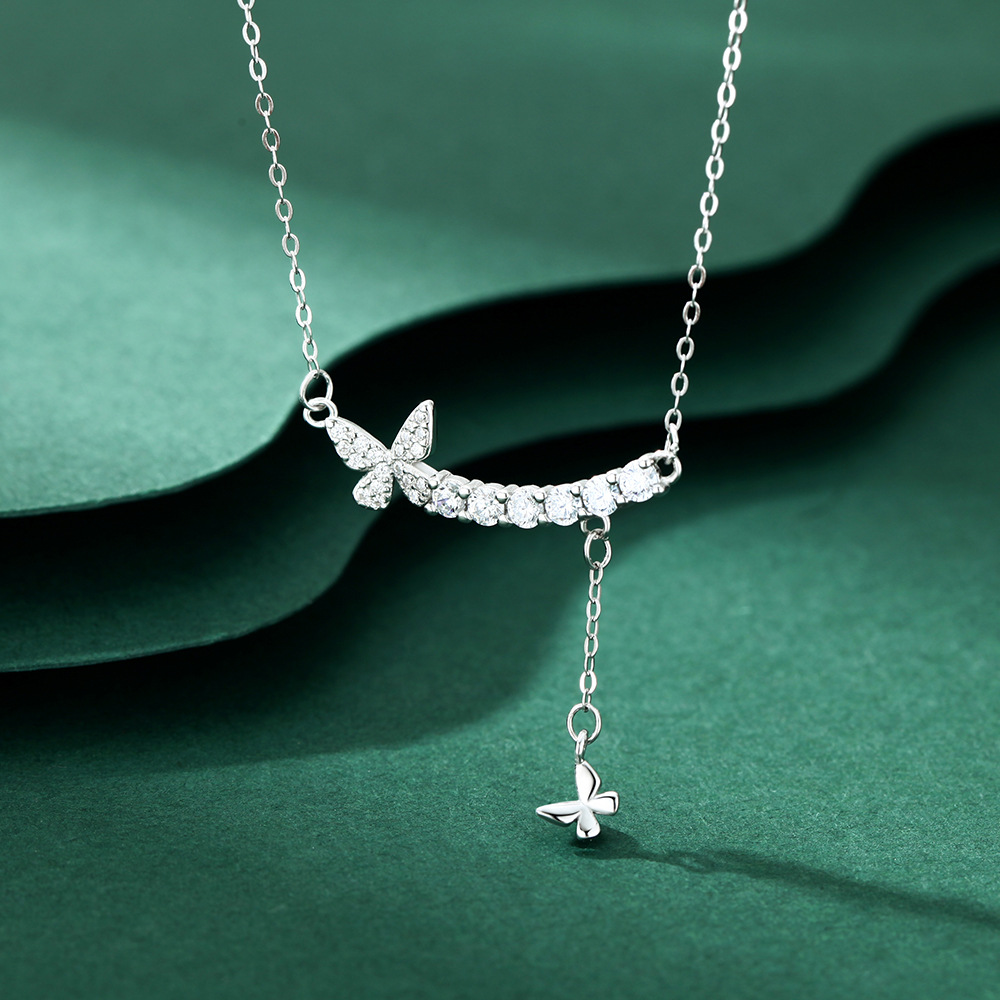 s999纯银流苏蝴蝶项链女百搭高级感锆石足银锁骨链新款轻奢配饰