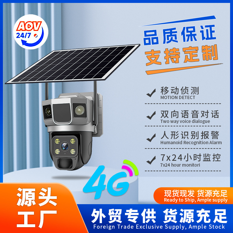 跨境爆款户外监控器果园鱼塘4G家用三球一体机三画面太阳能摄像头